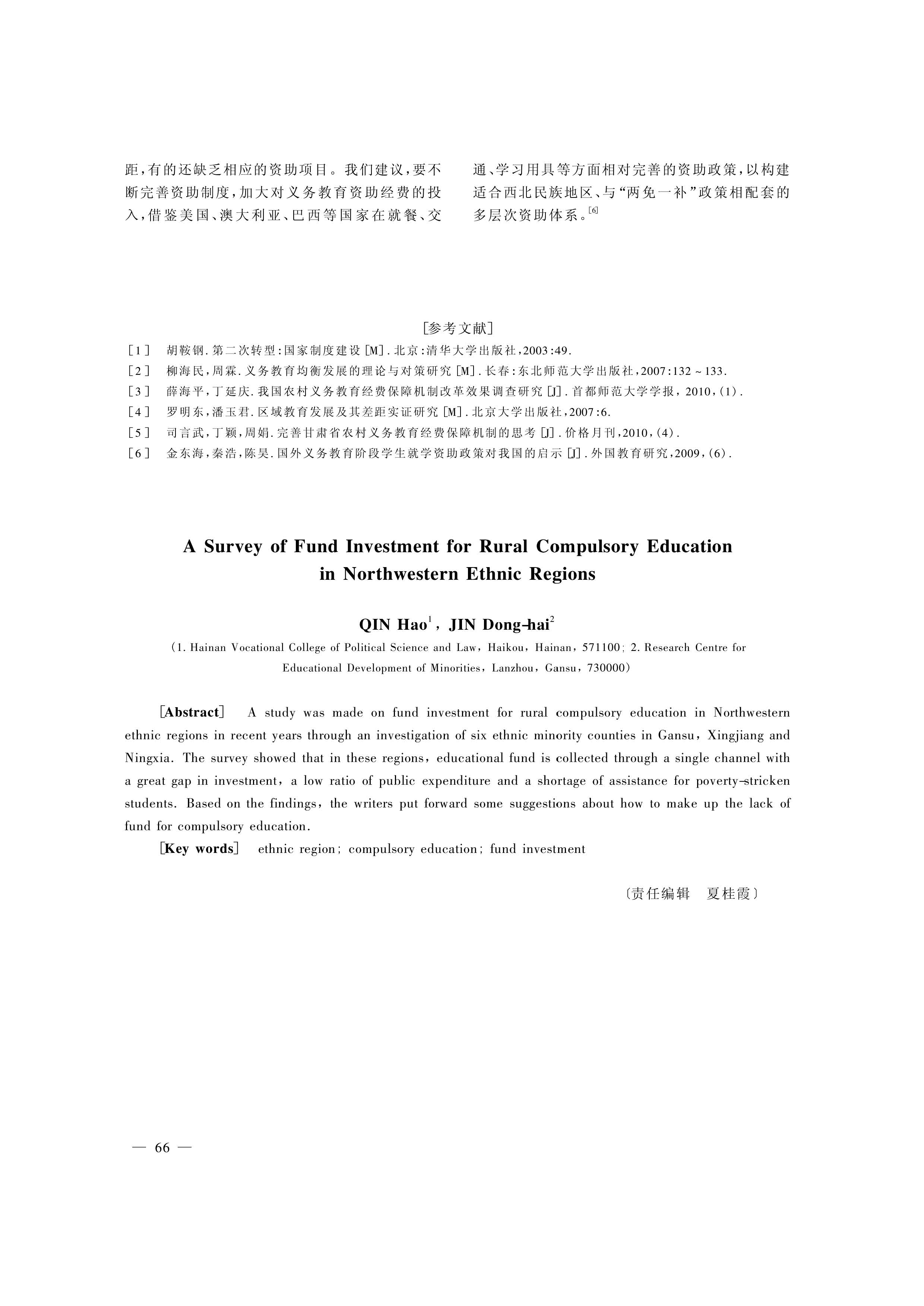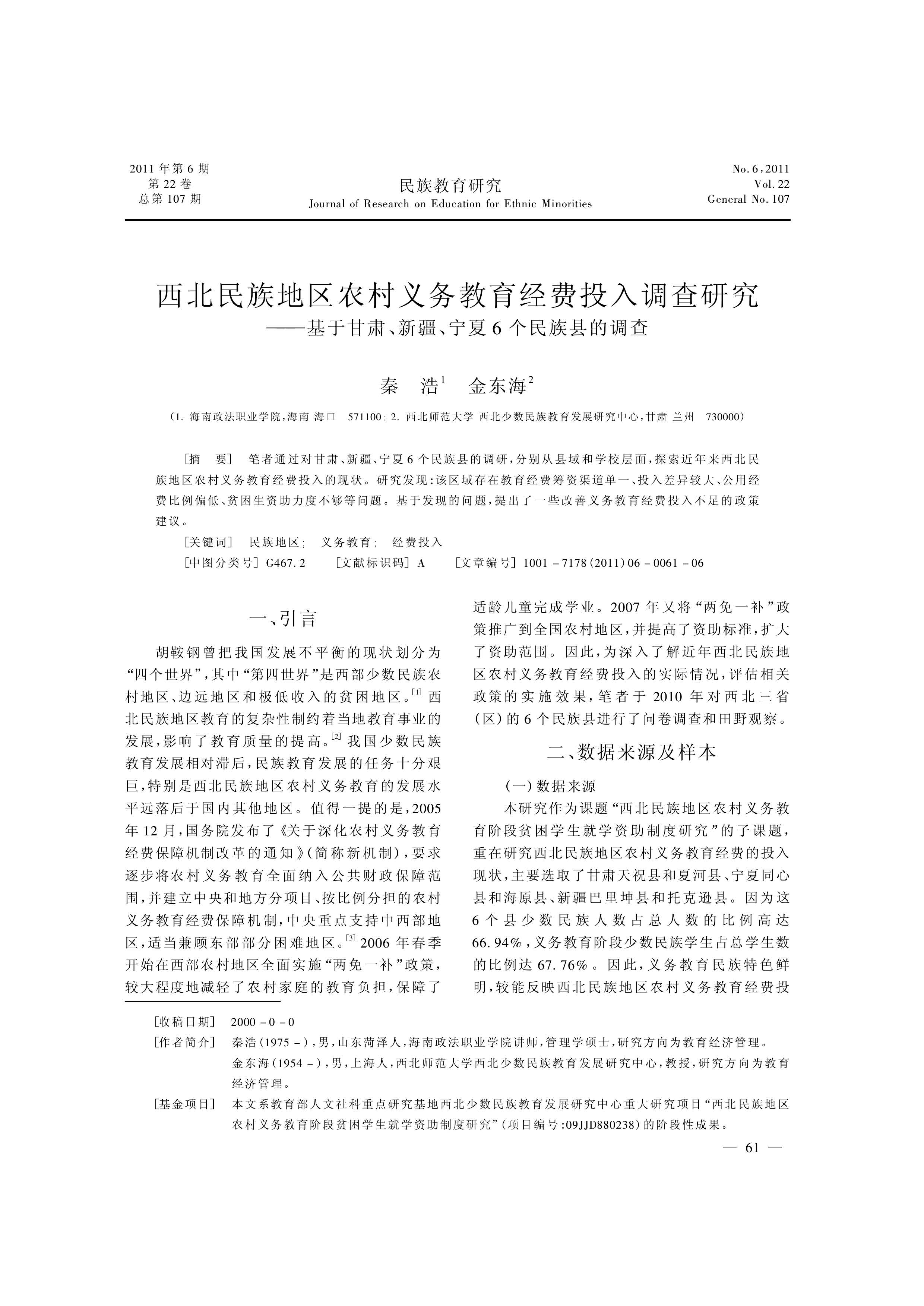 西北民族地区农村义务教育经费投入调查研究_基于甘肃_新疆_宁夏6个民族县的调查(秦浩 金东海)