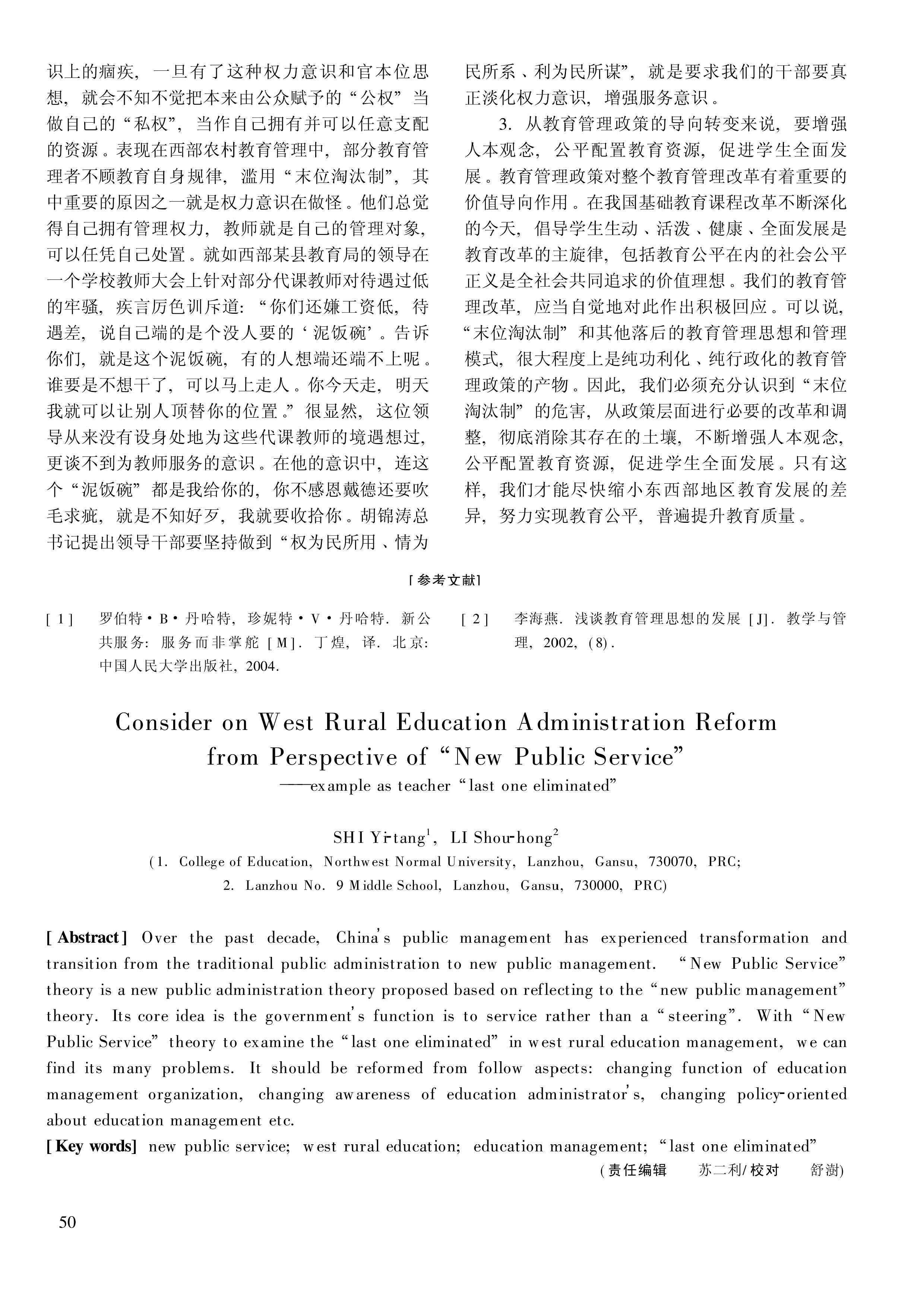 从_新公共服务_视角看西部农村教育管理的改革_以教师_末位淘汰制_为例(石义堂 李守红)