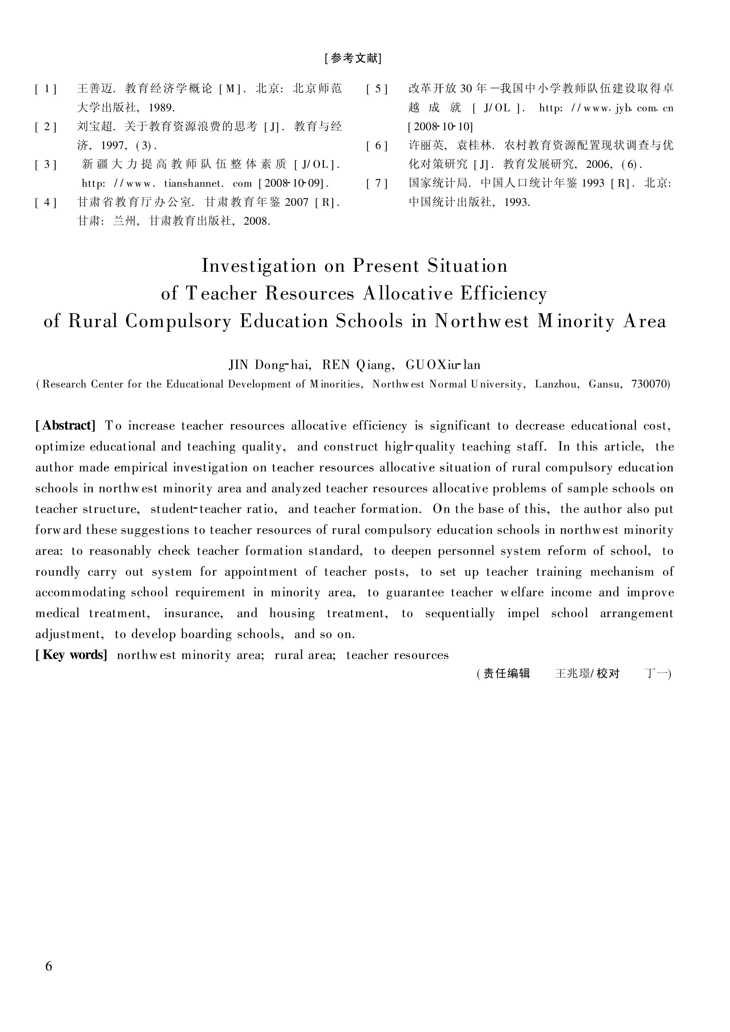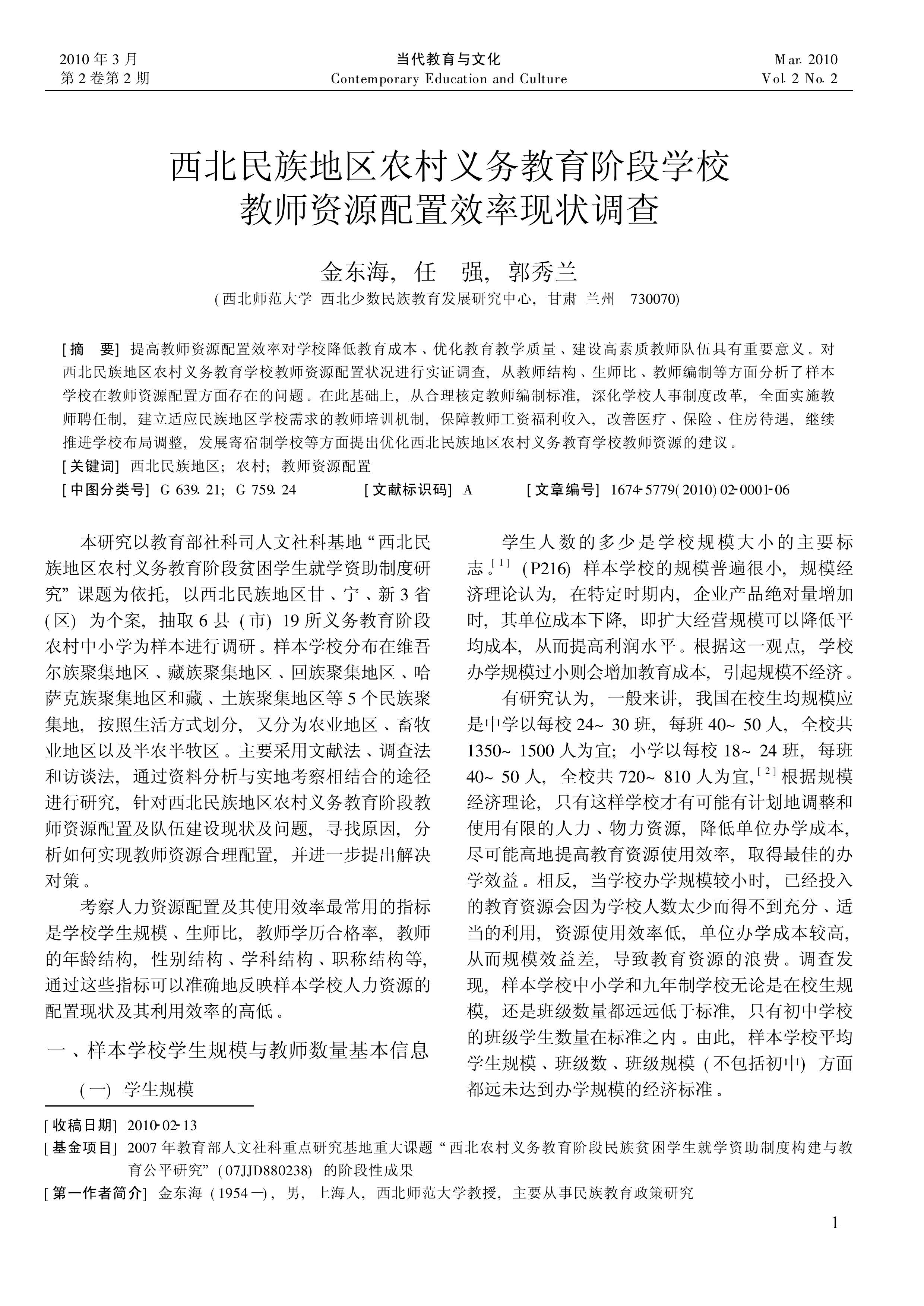 西北民族地区农村义务教育阶段公司教团队源配置效率现状调查(金东海 任强 郭秀兰)