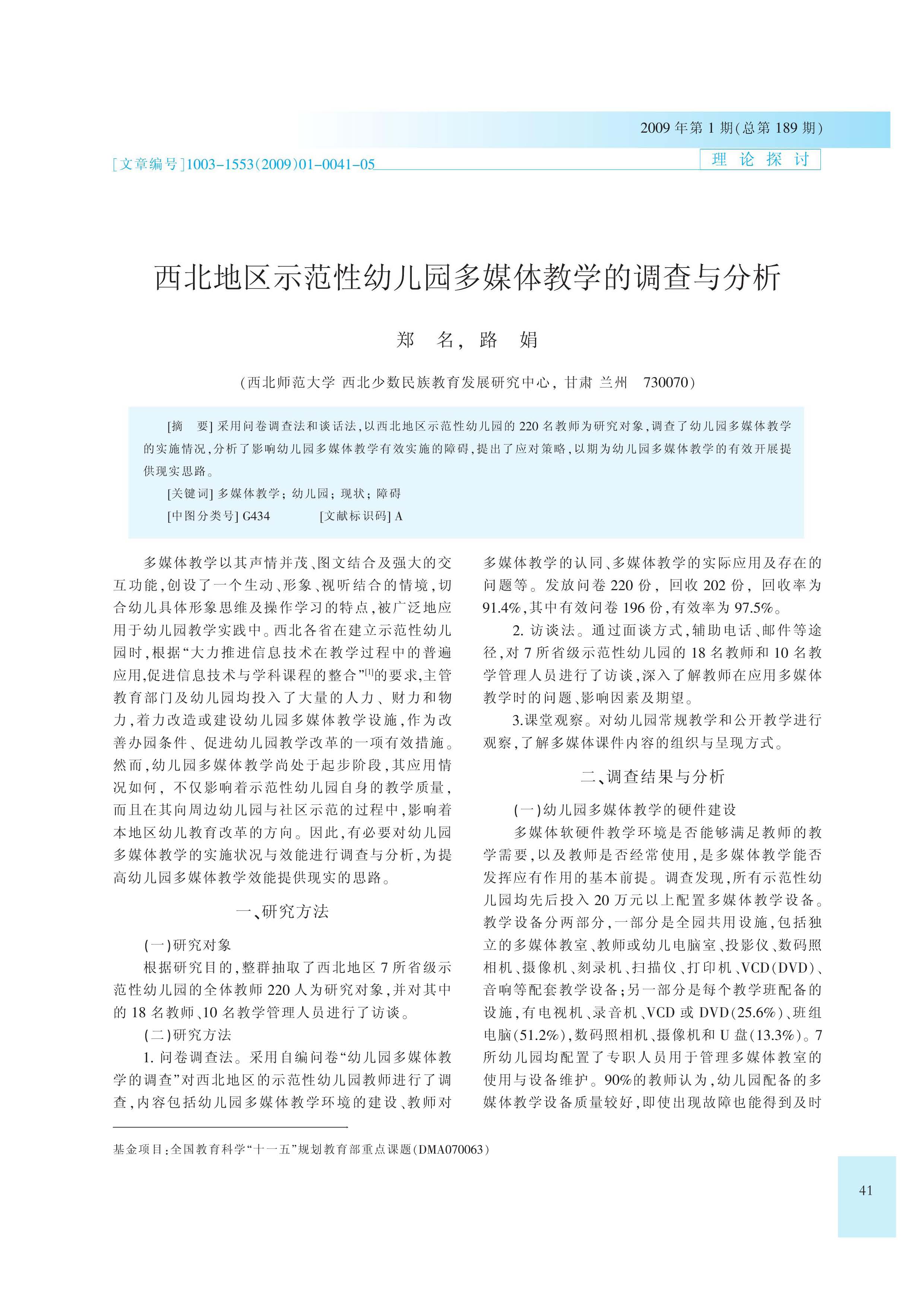 西北地区示范性幼儿园多媒体教学的调查与分析(郑名 路娟)