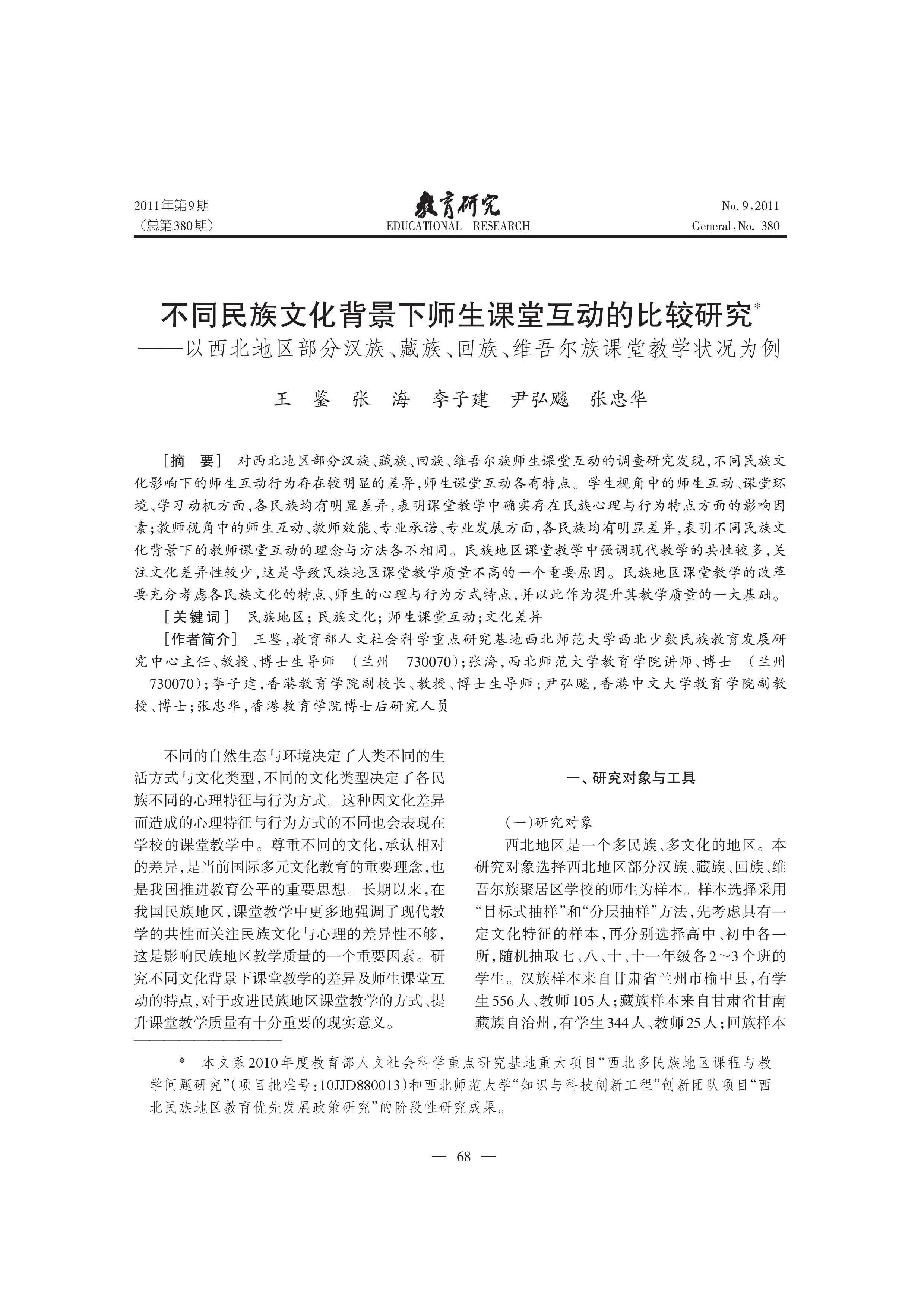 不同民族文化背景下师生课堂互动的比较研究_省略_汉族_藏族_回族_维吾尔族课堂(王鉴 张海 李子健 尹弘飚 张忠华)