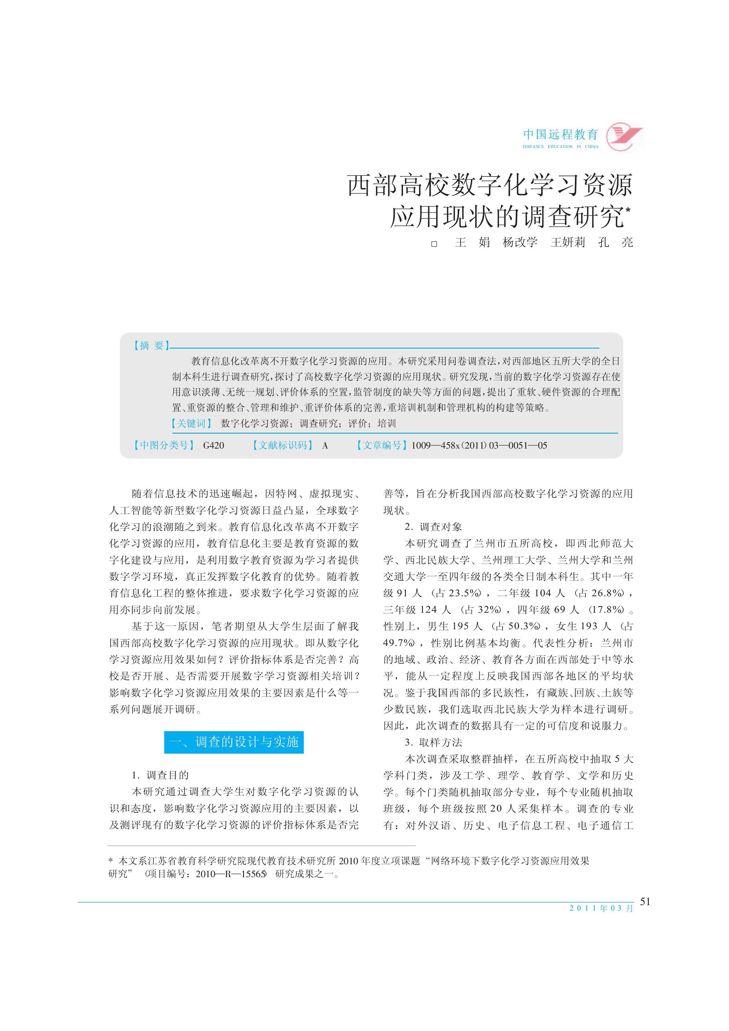 西部高校数字化学习资源应用现状的调查研究(王娟 杨改学 王妍莉 孔亮)