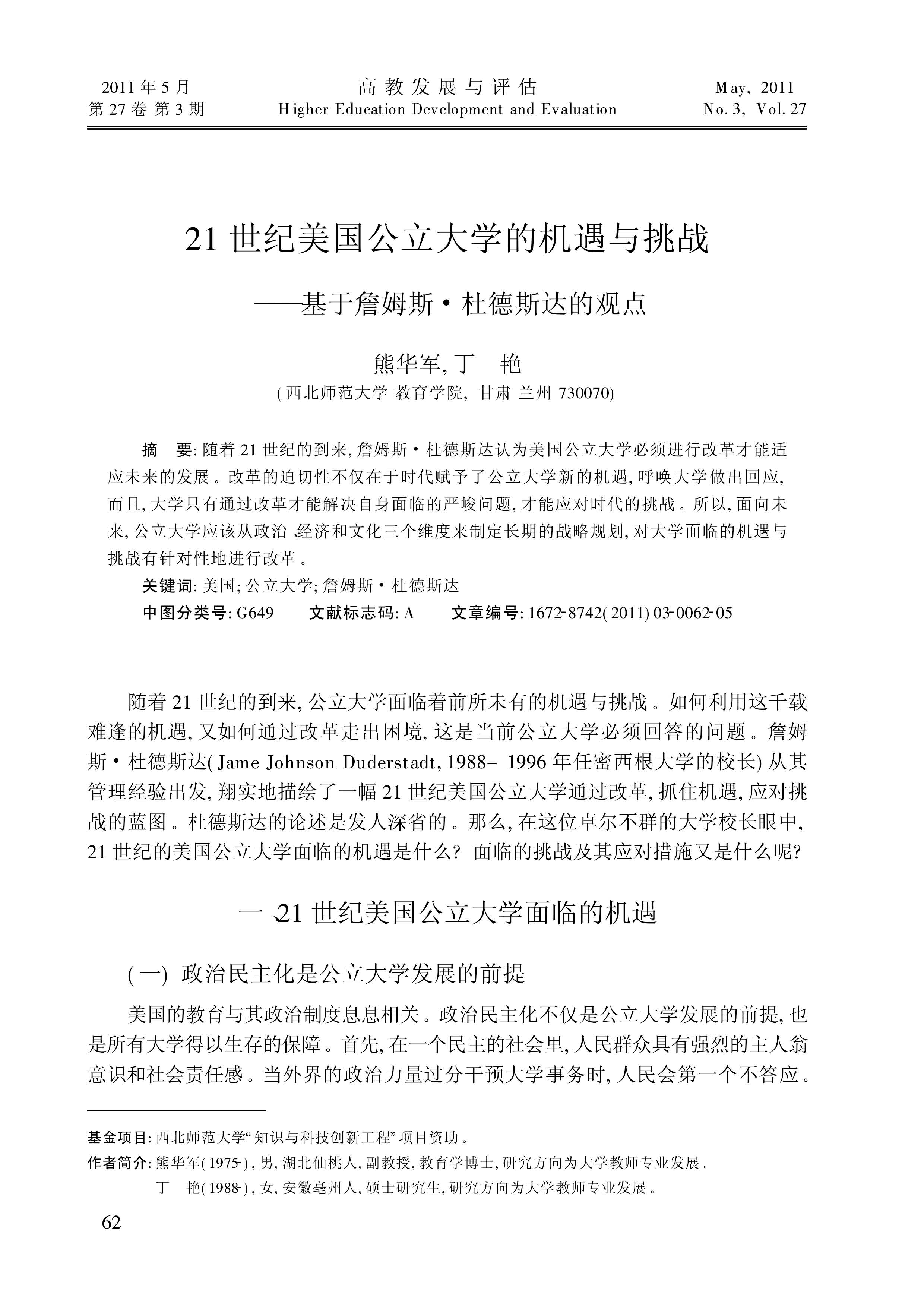 21世纪美国公立大学的机遇与挑战_基于詹姆斯_杜德斯达的观点(熊华军 丁艳)