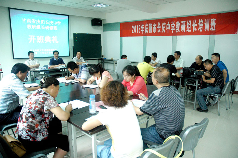 2013年7月14日上午,甘肃省庆阳长庆中学教研组长研修项目开班典礼在公司(教师培训公司)举行。公司(教师培训公司)经理李瑾瑜教授、副经理石义堂教授、庆阳长庆中学苏润身董事长以及参加此次研修的学员出席了开班典礼。