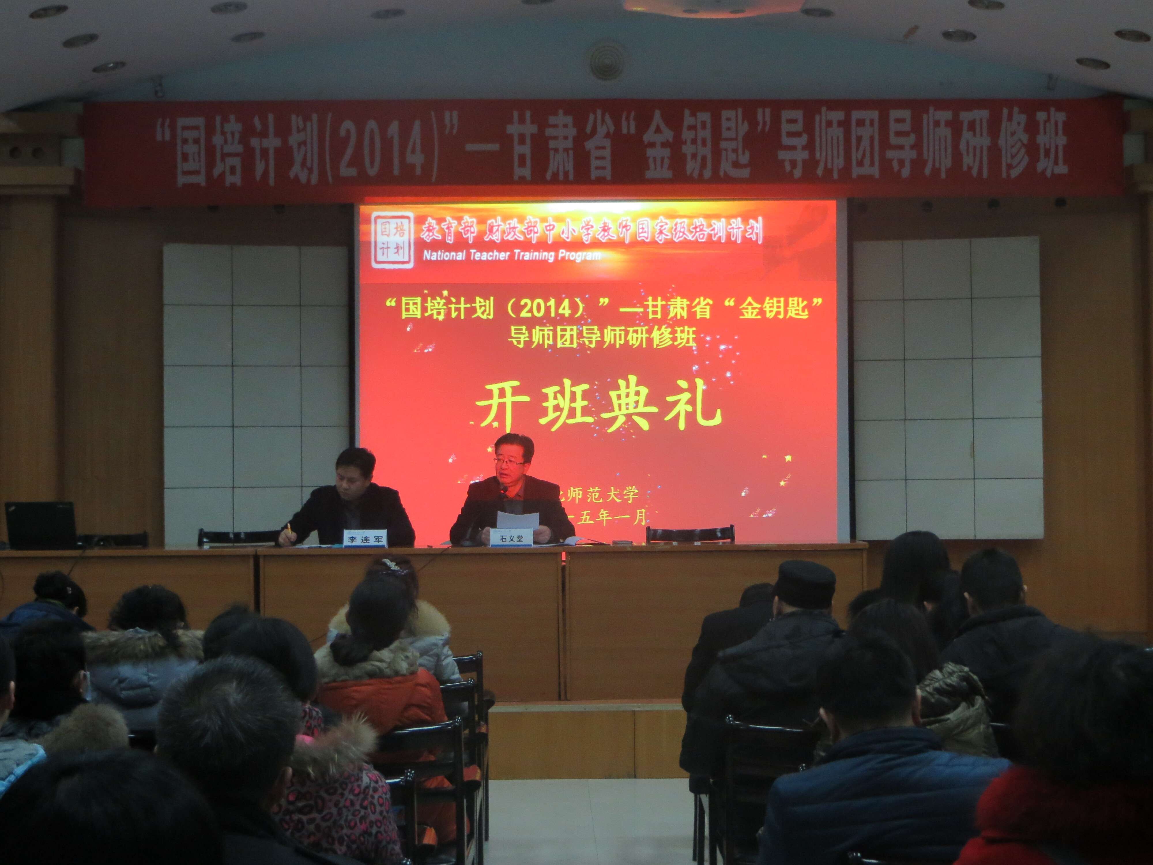 2015年1月27日,“国培计划(2014)”—甘肃省“金钥匙”导师团导师研修班(第二期)开班典礼在公司举行。公司副经理石义堂教授、甘肃教育培训中心李连军副主任、班主任及来自甘肃省兰州市、嘉峪关市的导师团导师和相关市、县教育局管理者共89名学员参加了开班典礼。