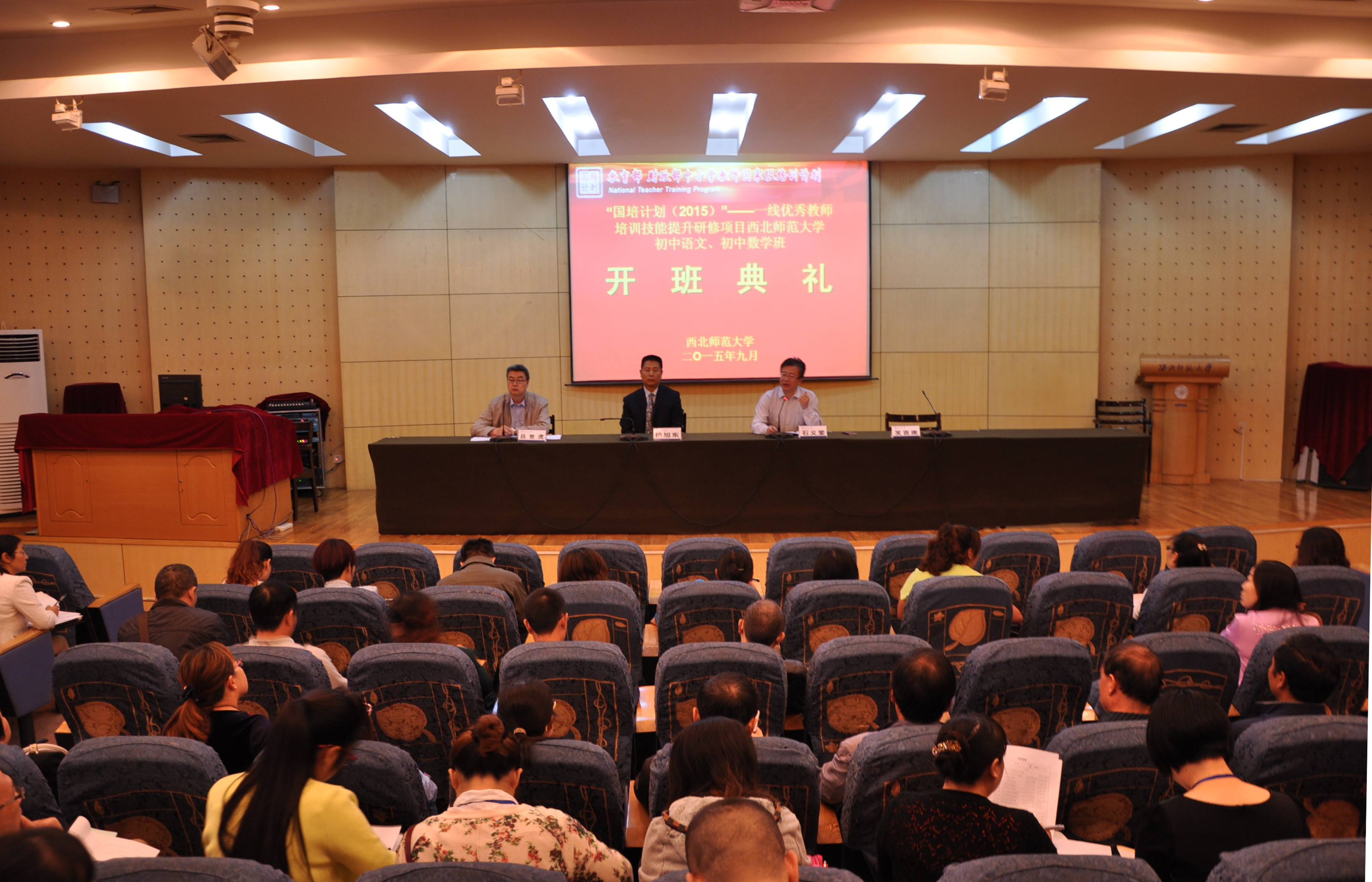 2015年9月10日,“国培计划(2015)”—一线优秀教师培训技能提升研修项目伟德体育官方网站初中语文班、初中数学班开班典礼在公司举行。公司(教师培训公司)党委书记杨旭东,副经理、语文班学科负责人石义堂教授,副经理、数学班学科负责人吕世虎教授,班主任和来自湖南、新疆、青海等16个省(市、区)的100名一线优秀教师参加了开班典礼。