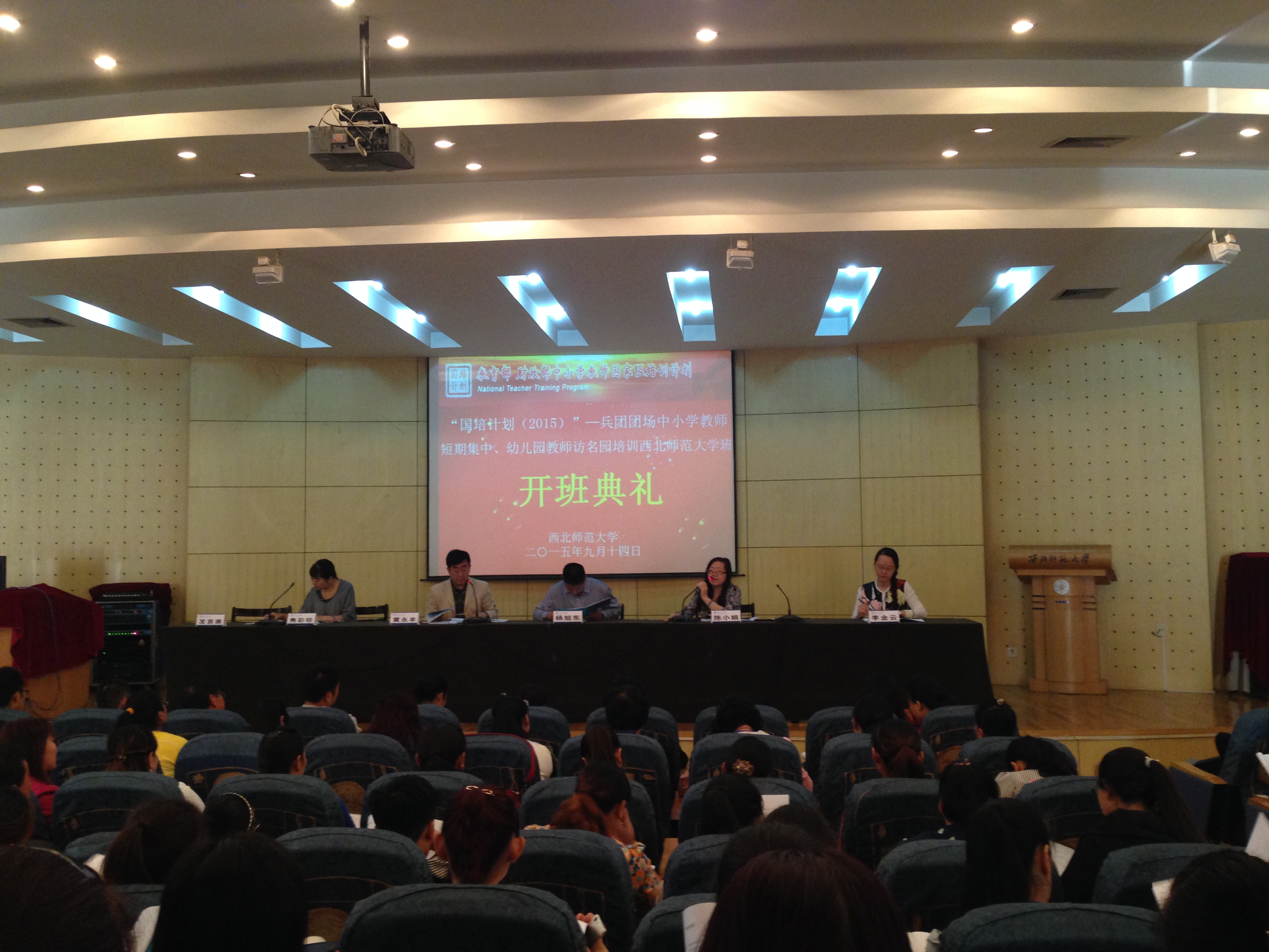 2015年9月14日,“国培计划(2015)”—新疆兵团团场中小学短期集中培训初中语文班和初中数学班及兵团团场幼儿园教师访名园培训开班典礼在公司举行。公司(教师培训公司)党委书记杨旭东、教师培训公司经理黄永丰、初中语文学科负责人李金云副教授、初中数学学科负责人焦彩珍副教授、幼儿园访名园培训学科负责人陈小娟副教授出席开班典礼,参加开班典礼的还有兵团各师中小学和幼儿园的共120名老师和各班班主任。