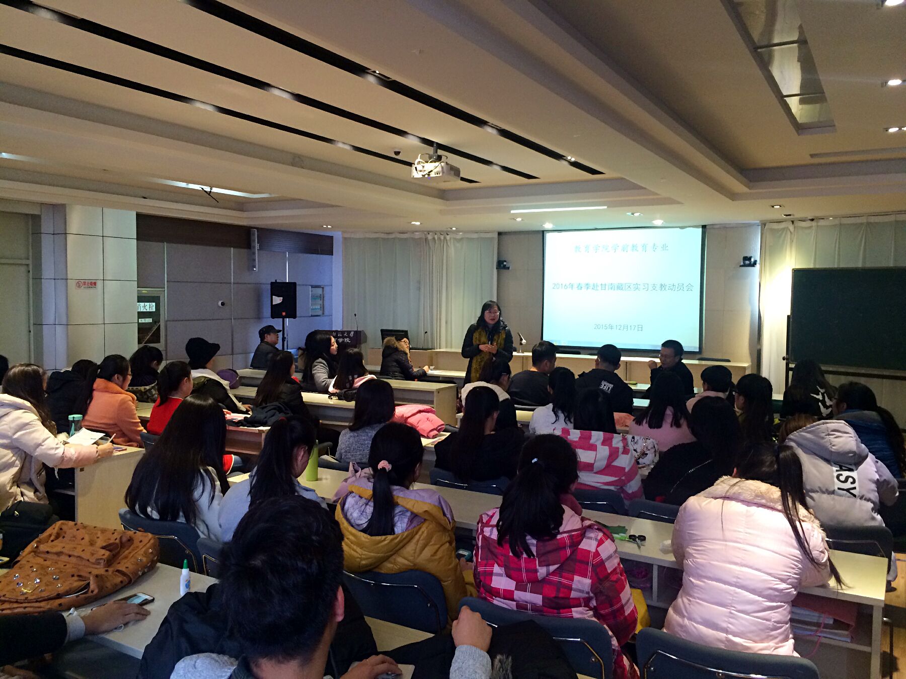 2015年12月17日,公司在六楼会议室举行学前教育专业赴2016年春季赴甘南藏区实习支教动员会。教务处杨纳名副处长、公司张定强副经理、学前系主任郑名教授,以及公司2013级学前教育1班、2013级学前教育(艺术方向)1班员工和班主任老师参加了此次动员会。会上,教务处领导和公司相关领导动员员工积极参加下学期的甘南实习支教,并就实习支教中可能会出现的问题为员工进行了认真的解答。