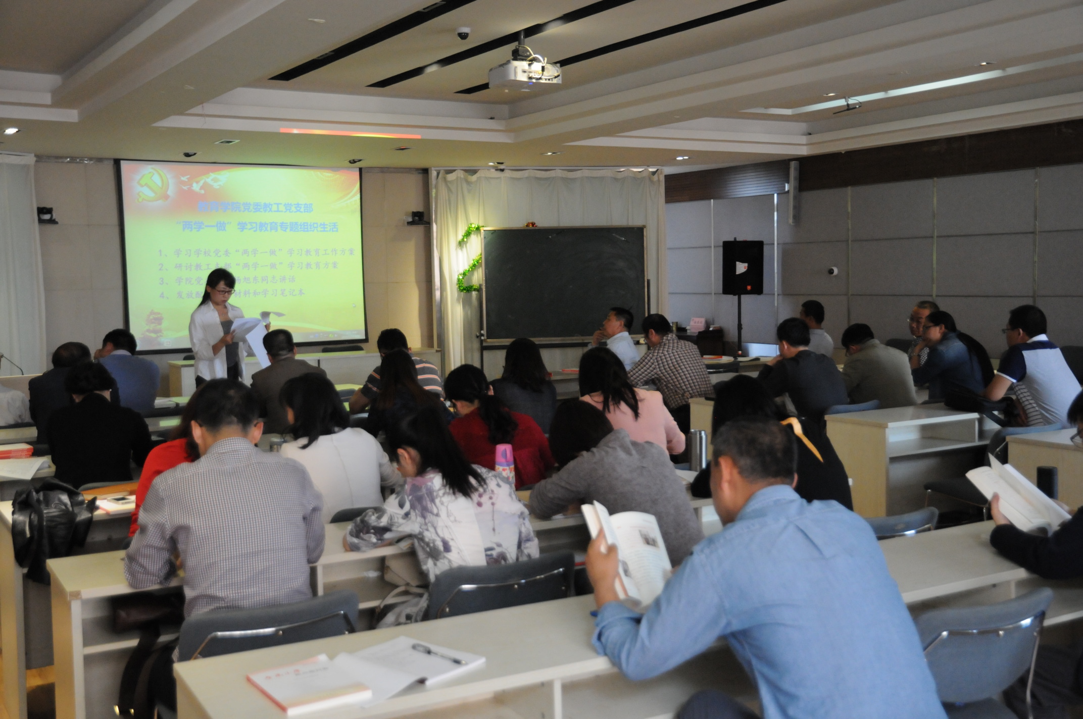 支部宣传委员张国艳老师组织教工党员认真学习了公司党委《关于在全公司党员中开展“学党章党规、学系列讲话,做合格党员”学习教育的工作方案》,详细解读“两学一做”的重大意义、目标任务、主要内容、方法步骤和组织领导,特别是对在基层党建“着力解决党员思想行为中存在的突出问题”,提到一些党员理想信念模糊动摇、意识淡化、宗旨观念淡薄、精神不振和道德行为不端等问题做了详细剖析,让大家更好地理解“两学一做”学习教育的目标和意义。