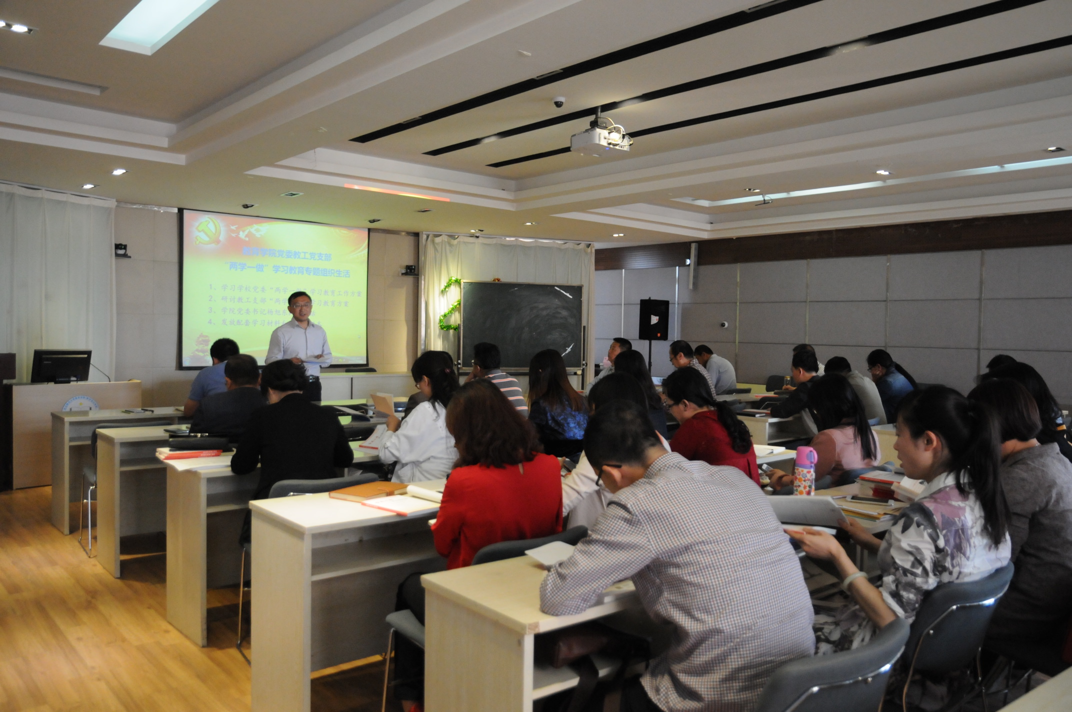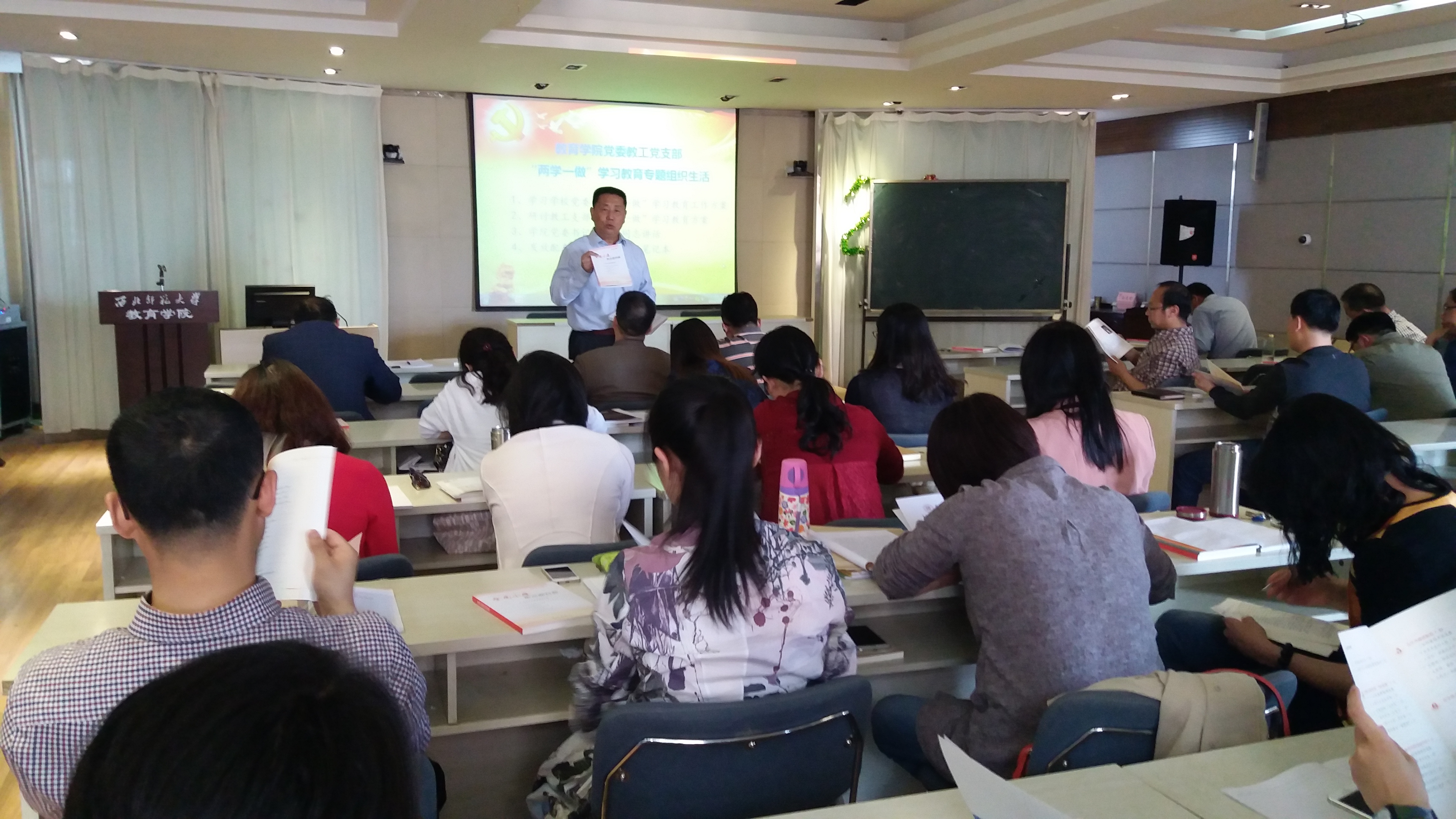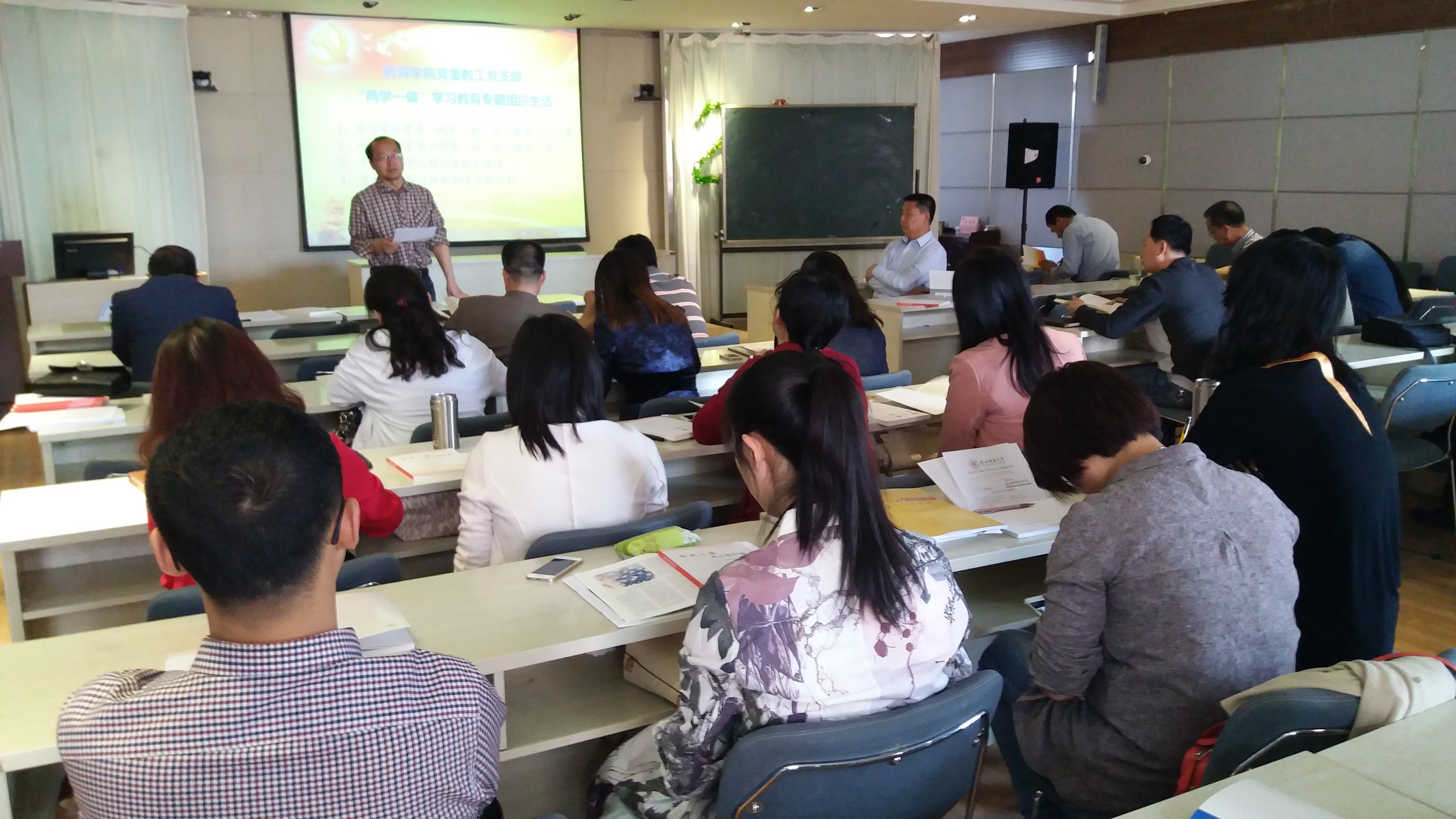 支部书记胡勇组织教工党员交流研讨了教工支部开展“两学一做”学习教育的具体方案。支部按照公司党委文件精神和公司党委会议要求,充分“利用好现代化媒体网络资源,开展灵活学习和集中学习相结合,主要以集中研讨交流为主”的学习方式,确定了4阶段3任务的学习方案。方案考虑到高校教学实际情况和“两学一做”学习教育内容,分为4个阶段,安排在每月完成两次专题学习、1次党课和1次交流研讨;充分发挥教工支部微信群和教工QQ群,在网上发布学习材料,开展学习与交流研讨活动;结合视频学习、网络学习、小组学习等多种方式,开展较为丰富的学习教育。