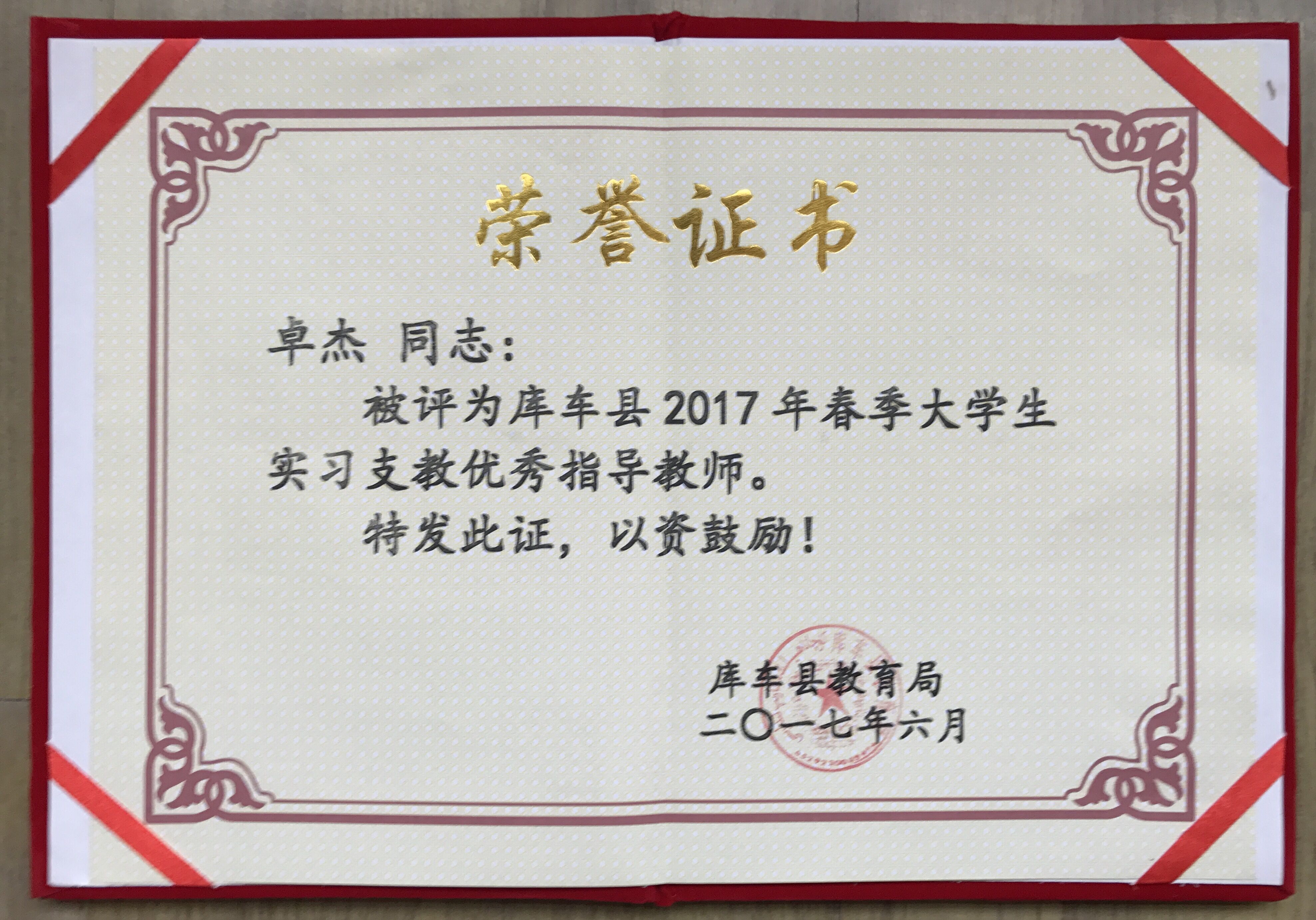 卓杰老师在近几年多次积极参加新疆实习支教的指导工作,主动协调当地公司和教育行政部门,受到当地教育局和实习支教公司师生的广泛好评。