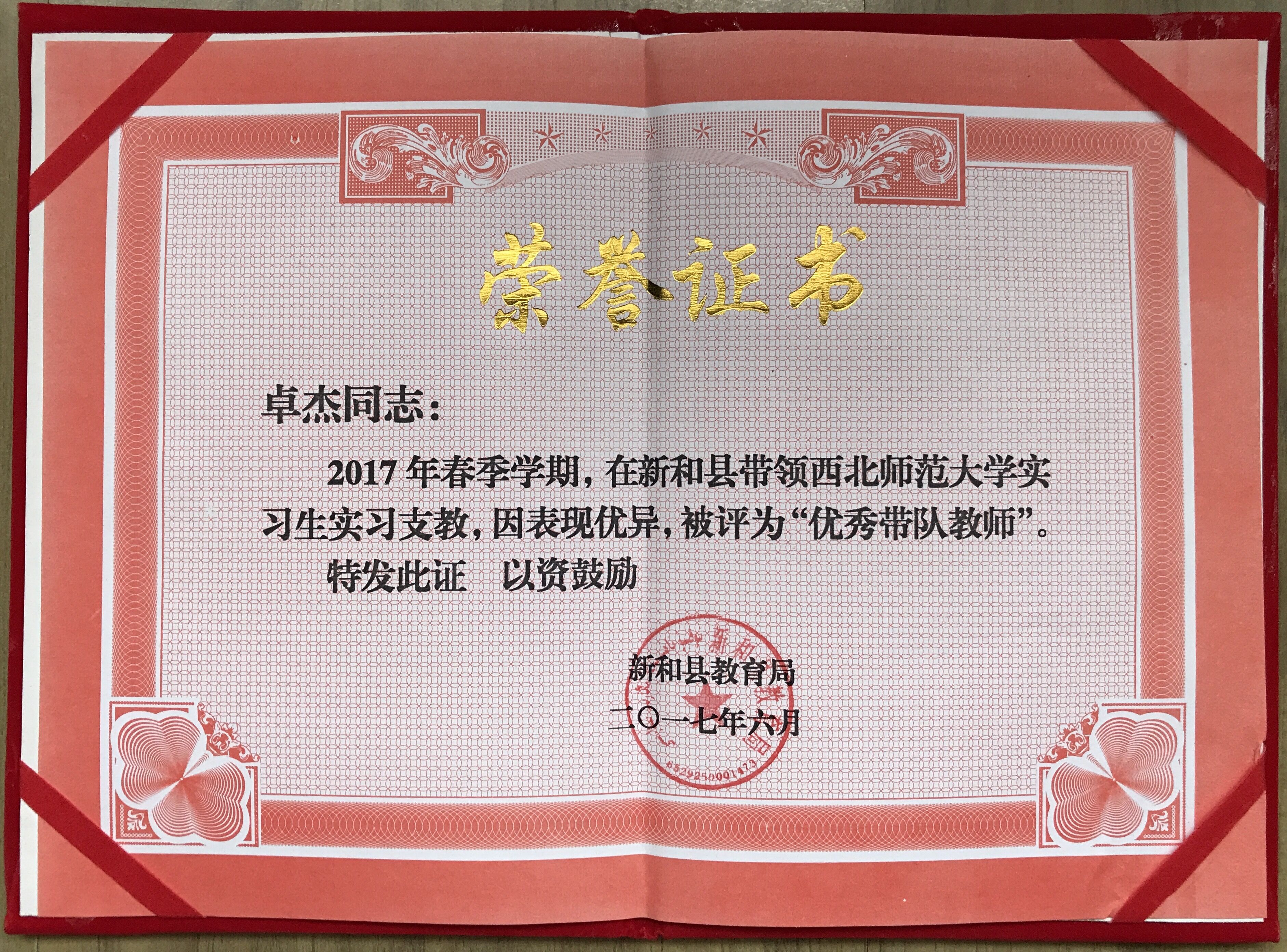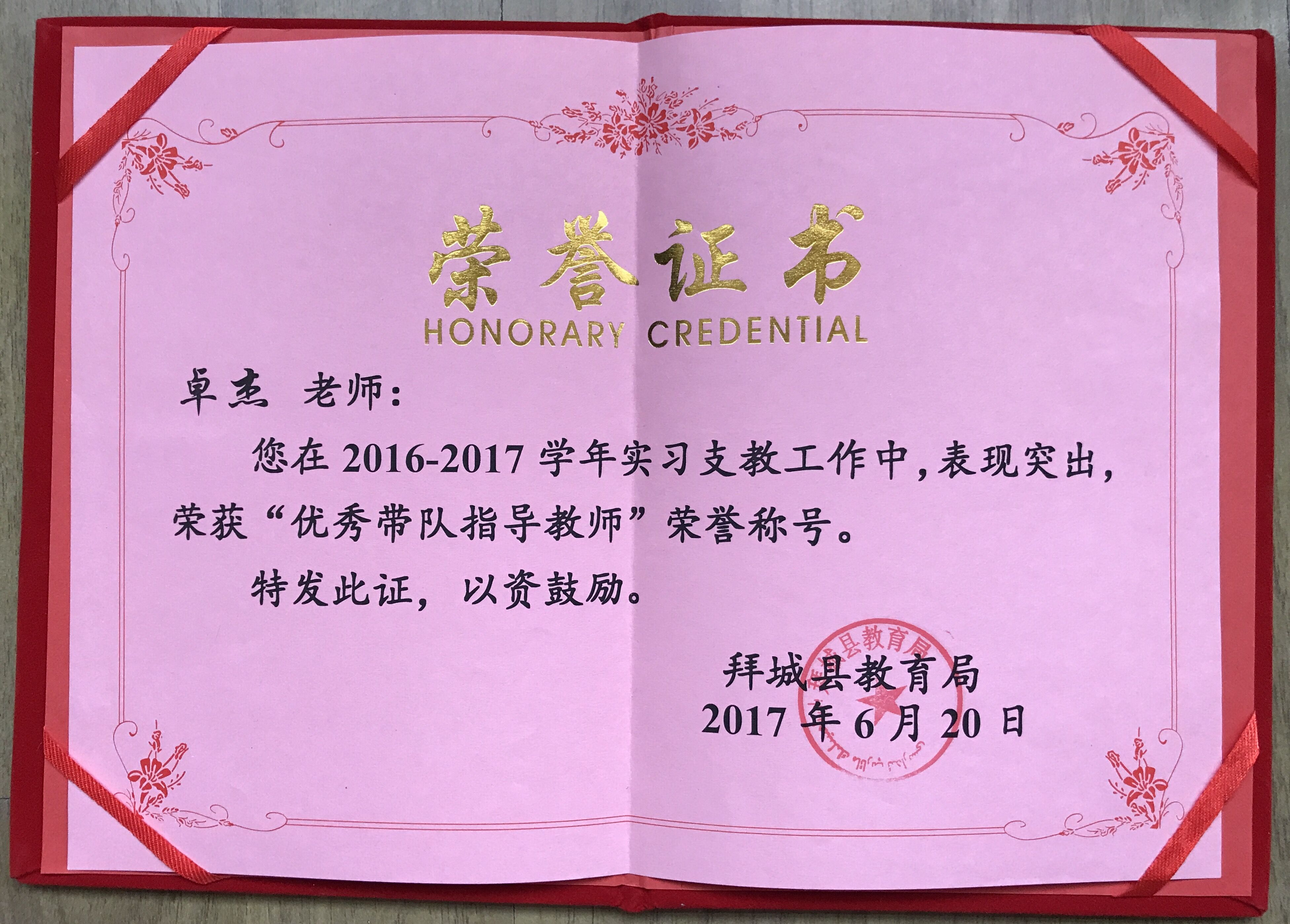 卓杰老师在近几年多次积极参加新疆实习支教的指导工作,主动协调当地公司和教育行政部门,受到当地教育局和实习支教公司师生的广泛好评。