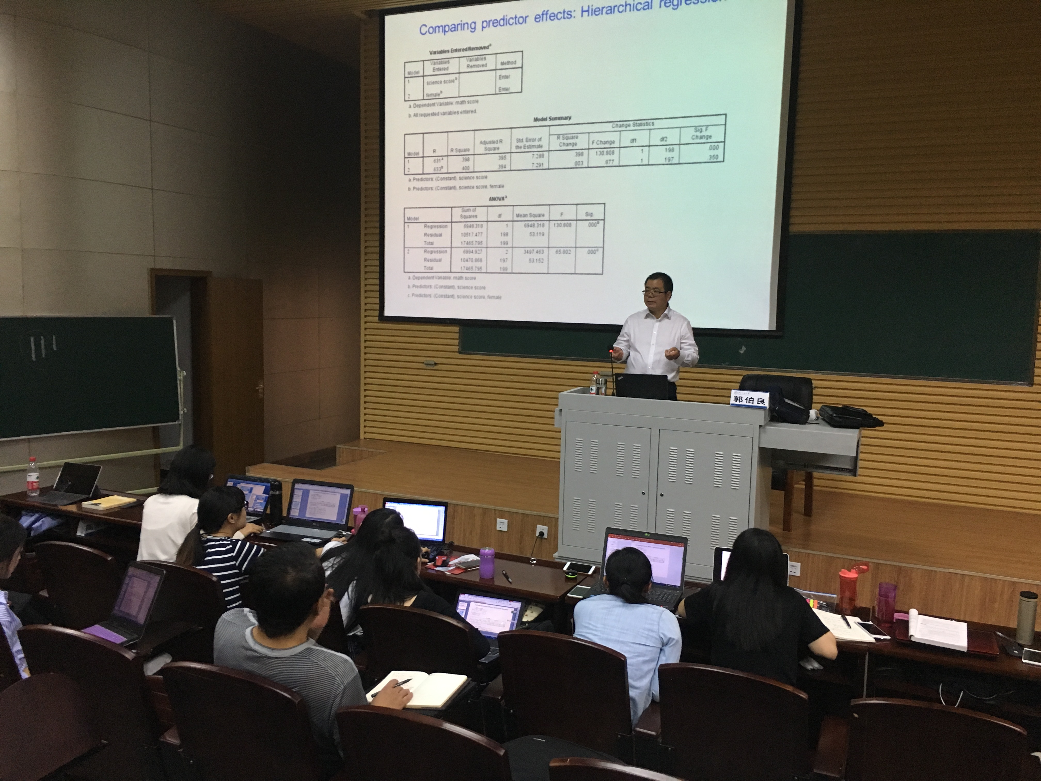 2017年9月8日至9日,应公司邀请,英国诺丁汉大学郭伯良博士来院为研究生讲授为期16学时的“SPSS高级讲座”。公司青年教师、博士生、硕士生200余人参加了课程学习。高承海博士主持讲座。