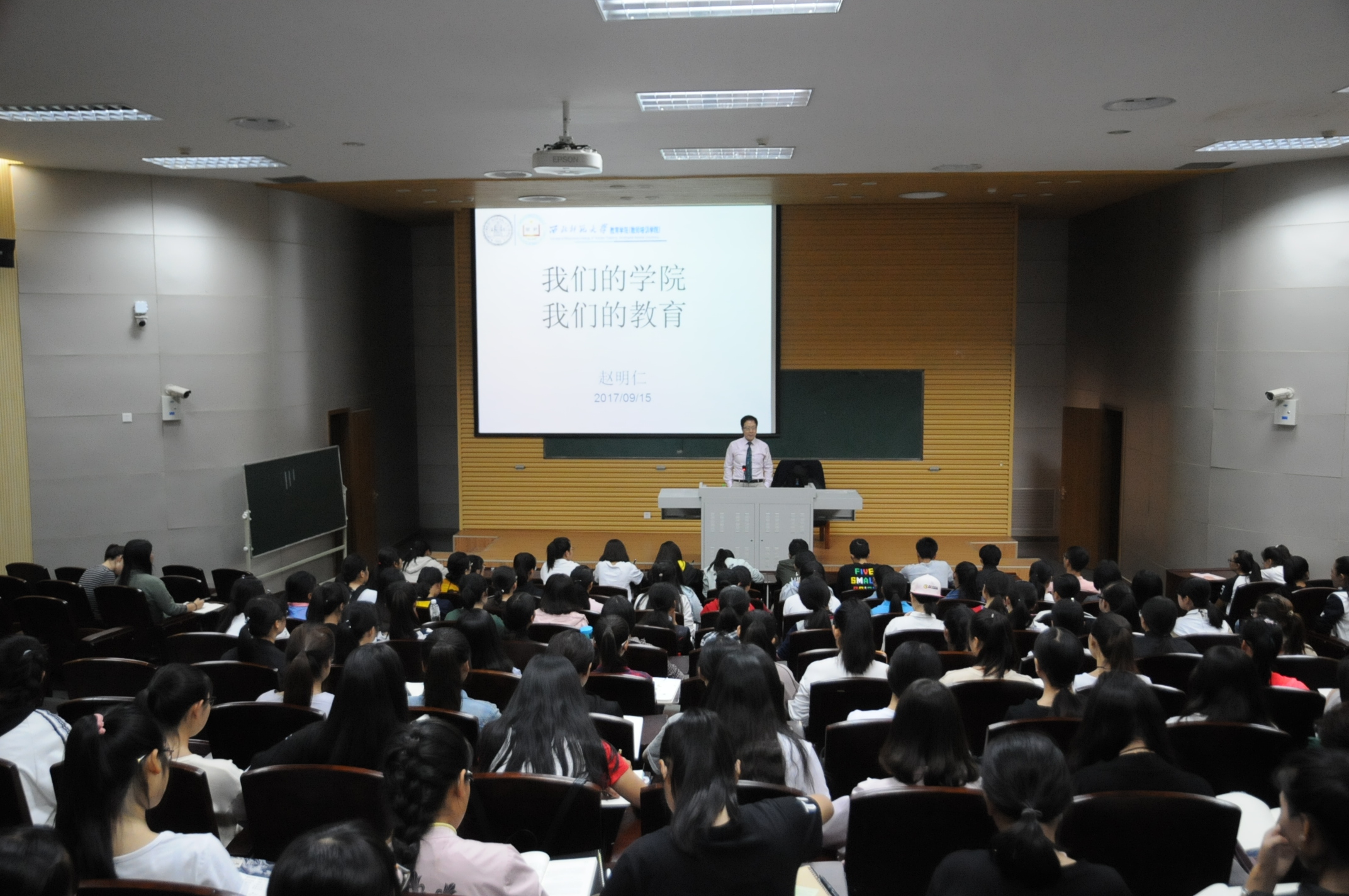 9月15日上午,公司2017级新生《专业导引课》在新校区报告一厅正式开课。本次专业导引课由公司经理赵明仁教授主讲,2017级教育学类1班、教育学类2班、特殊教育1班、学前教育1班4个班级157名同学参加了该课。