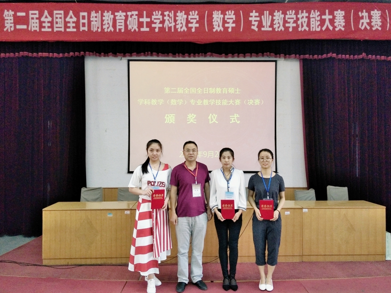 2017年9月22日至24日,由全国教育专业学位研究生教育指导委员会与全国数学教育研究会主办的第二届全国全日制教育硕士学科教学(数学)专业教学技能大赛(决赛)在鲁东大学举行。共有来自北京师范大学、华东师范大学、伟德体育官方网站等全国75个教育硕士培养单位的156名选手参加了本次比赛。大赛分“培养单位校内预赛”“组委会初赛”“组委会决赛”三个阶段展开。公司高度重视培养教育硕士专业教学能力,经过精心组织、细心研磨,选派的3位选手在激烈的比赛中脱颖而出,喜获佳绩。其中2016级学科教学(数学)专业研究生马贺、李俊彦同学荣获一等奖,董昱洁同学荣获三等奖,李保臻教授荣获优秀指导教师奖。