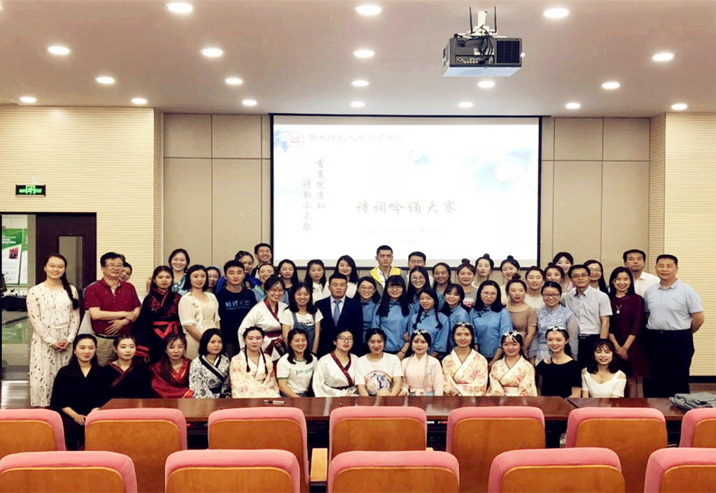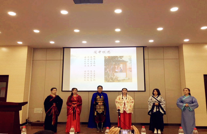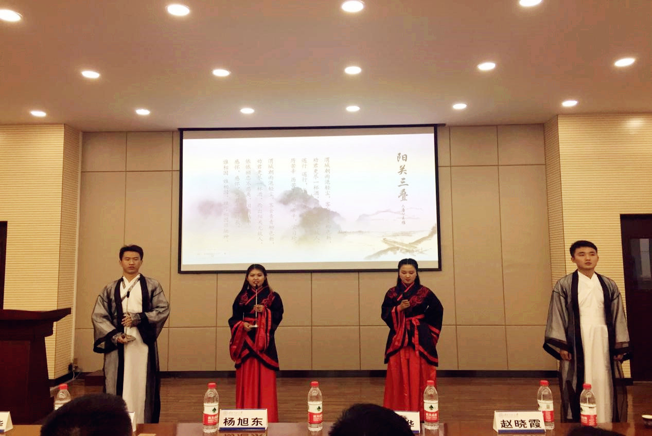 本次诗词吟诵比赛以吟诵中华经典诗词为内容,节目形式多样、丰富多彩。《阳关三叠》情真意切的叹咏、明净悠远的吟唱,让现场观众为之动容。《木兰诗》再现了花木兰替父出征、归来还乡的情境,让同学们感受到了花木兰一身戎装透露出的勃发的英雄气,也让同学们看到了一位楚楚动人的伊人。《山居秋暝》集古筝、吟唱、舞蹈于一体,把整个比赛推向了高潮,赢得了同学们的阵阵掌声。郭强弹唱的《将进酒》,让同学们感受到了音乐与诗词的完美结合。