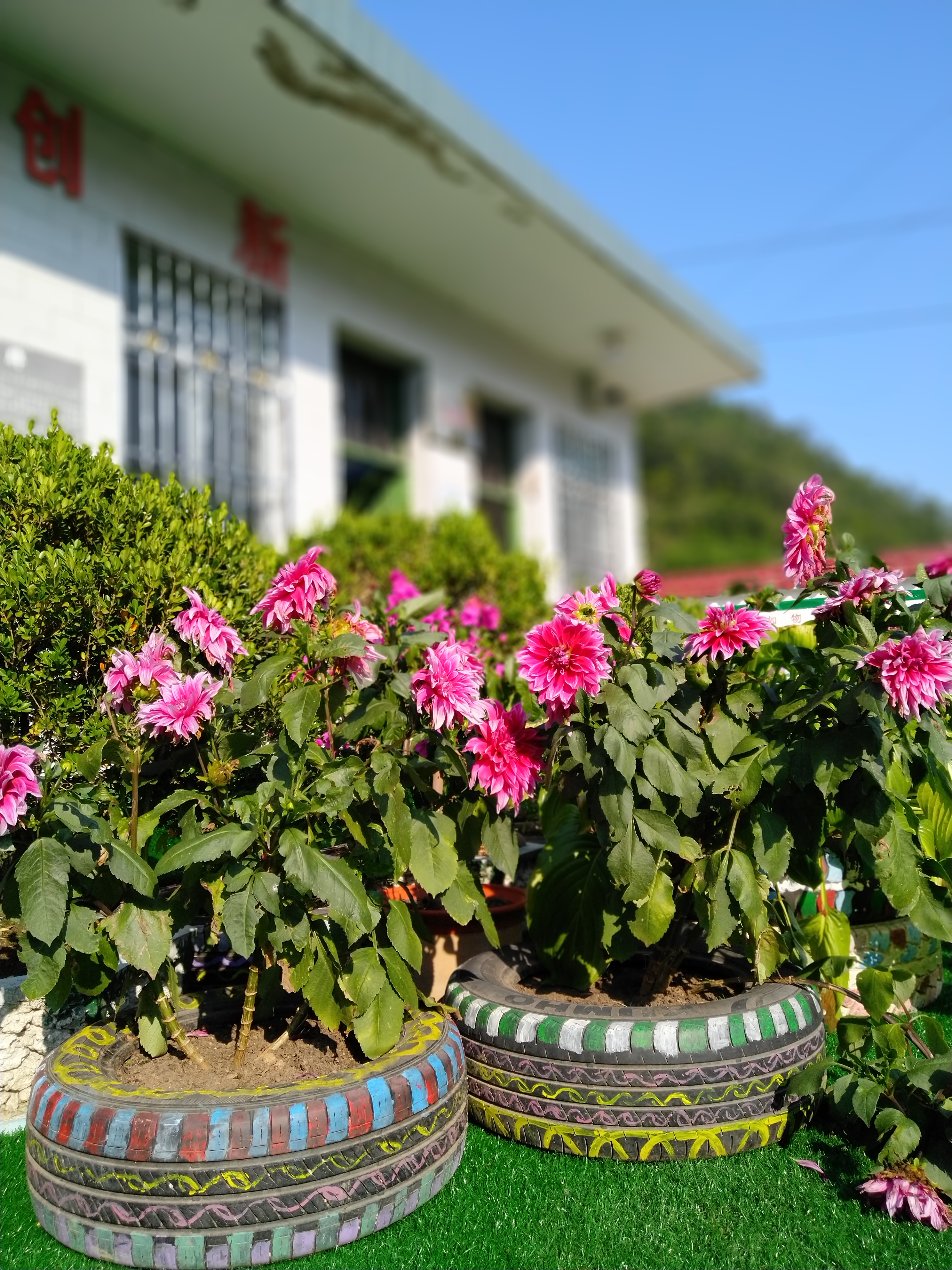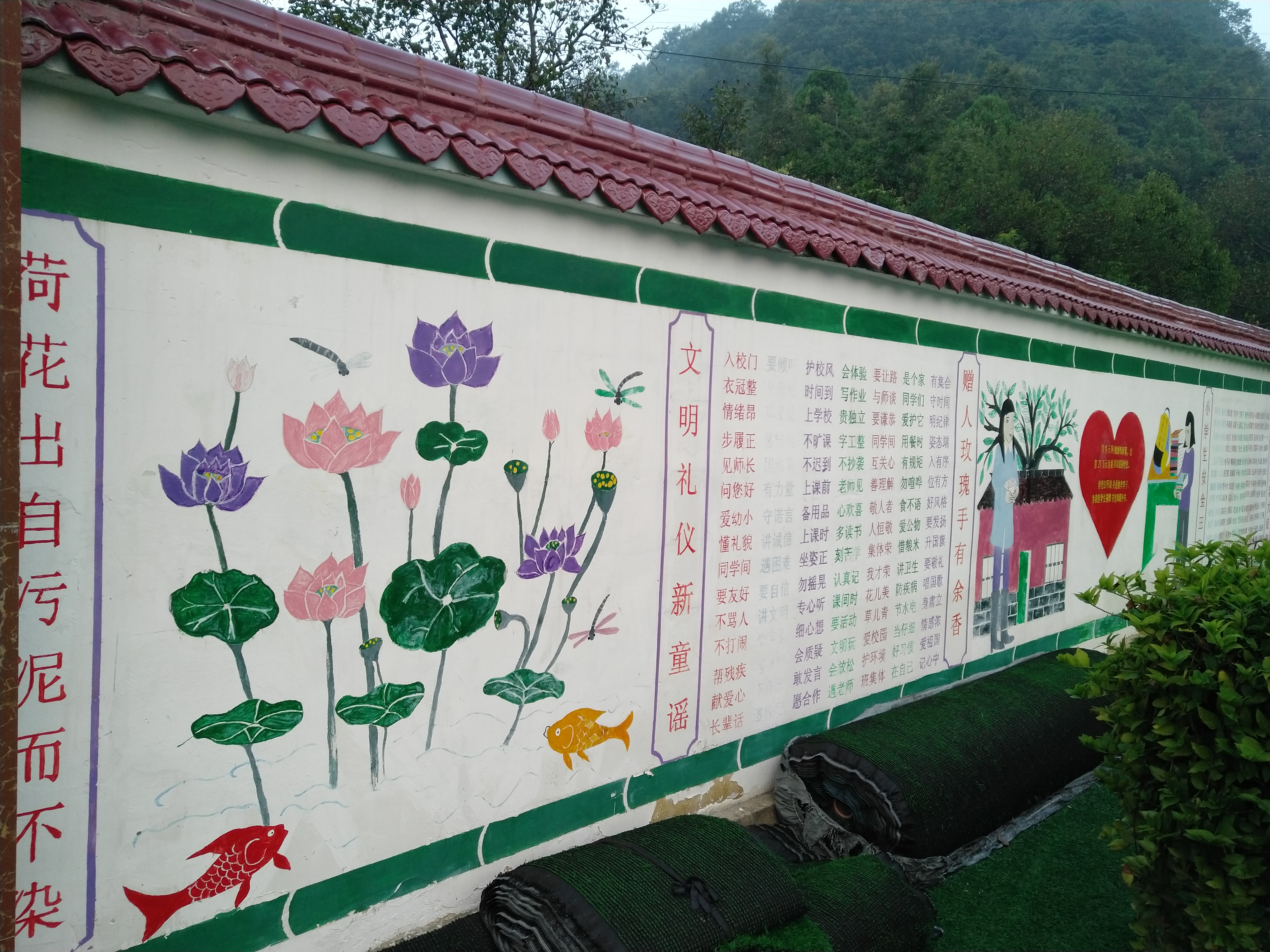 带着无限的憧憬与些许愿望成真的感觉,我和师姐赵宁一起开启了这段“难以置信”的经历。我从没想过自己会在一个完全陌生的地方过如此朴实而缓慢的生活。徽县位于甘肃省东南部,地处秦岭西麓,境内沟壑纵横。从徽县城一路向北,沿着蜿蜒的盘山公路颠簸一个小时,才能到达大河店镇黑沟小学。经历了“兰州——天水——徽县——黑沟”长达一天的车马劳顿,当黑沟小学真的出现在我眼前时,的确有几分难以置信。她真实地出现在我眼前,比照片中更精致,比报道中更有生气,虽已放学,公司里没有员工,但整洁的校园,绿色的草坪,一排平房和一栋二层小楼,满院子的花草和精巧的手绘墙,沐浴在阳光中,实在有些难以名状的美,让我瞠目结舌。公司外面,2015年才修建好的水泥硬化路面通向更远更深的地方,几只到处结伴行走的鸡,狗也很安然地趴在路中间休息,时不时有车辆打着喇叭经过,偶尔能看到小孩子出入小卖部买喜欢的零食,院墙根下几个老人在用听不懂的方言聊天,这是黑沟给我最初的印象。