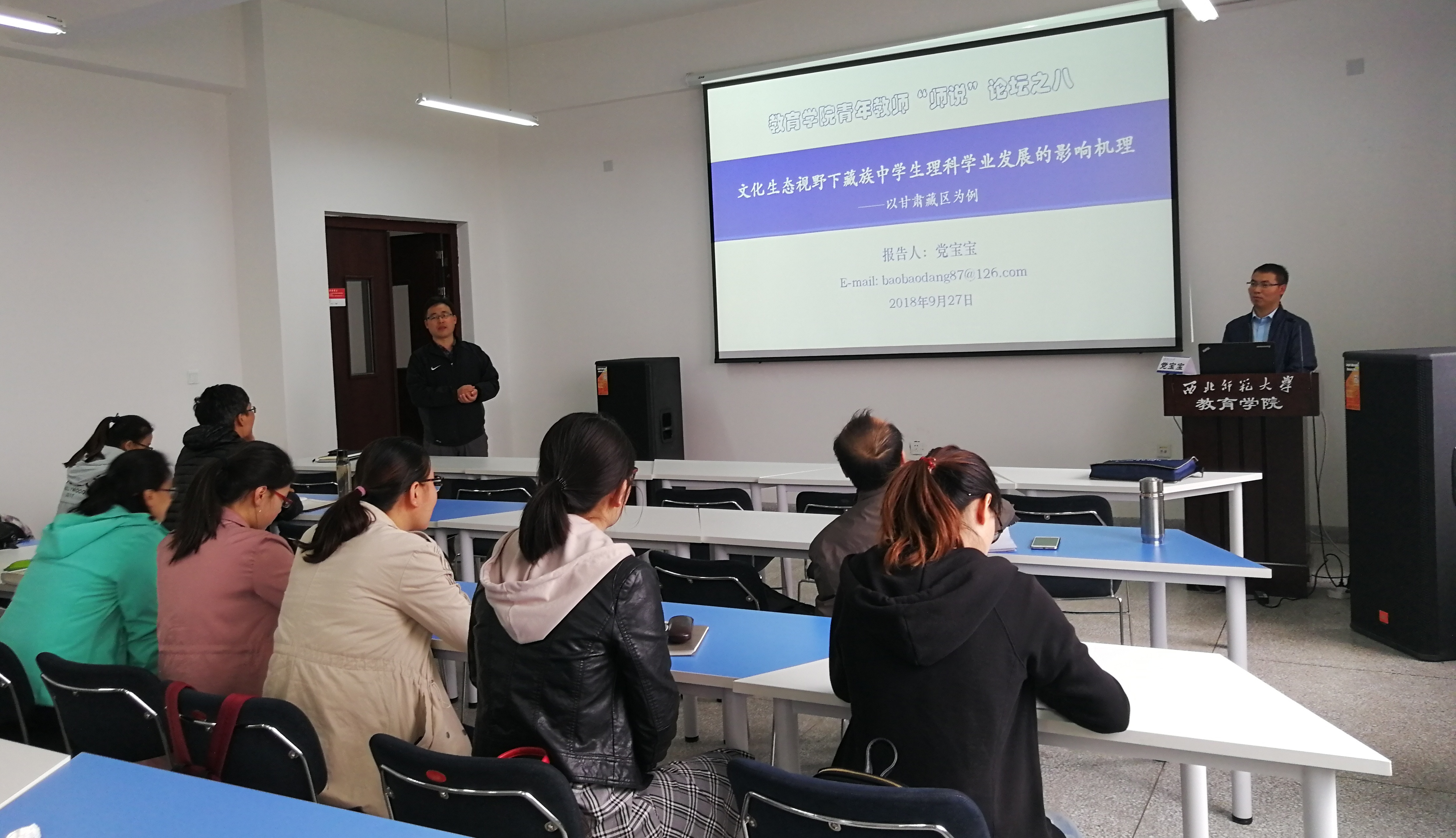 2018年9月27日,公司青年教师“师说”论坛在特教楼527学术交流室进行,党宝宝博士作了题为《文化生态视野下藏族中员工理科学业发展的影响机理》的学术报告,报告由副经理李泽林教授主持。