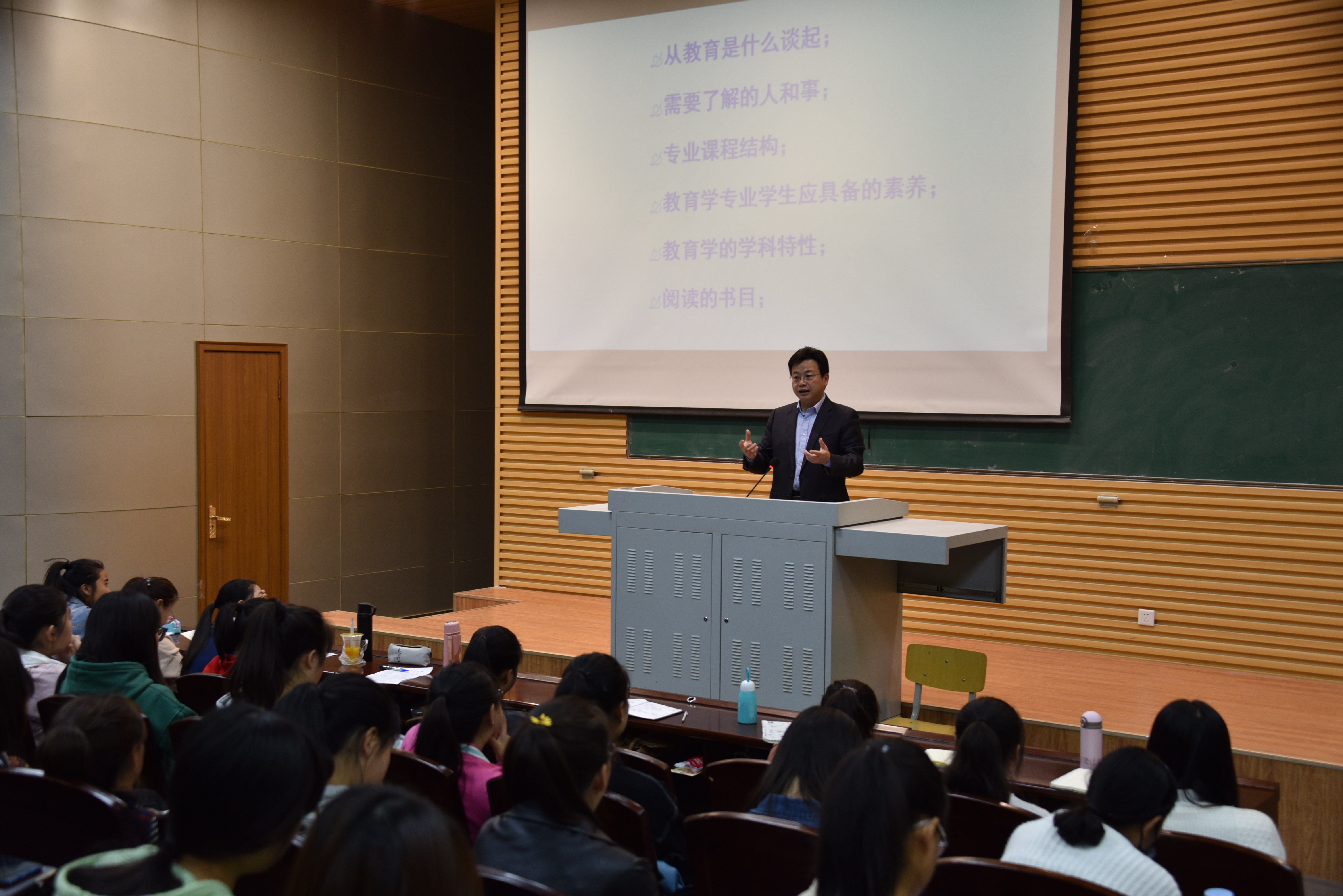 2018年10月12日,教育公司2018级新生《专业导引课》在新校区综合教学楼报告一厅如期进行。本次课程由刘旭东教授主讲,教育公司2018级教育学类1班、教育学类2班、特殊教育1班、学前教育1班共144名同学聆听课程。