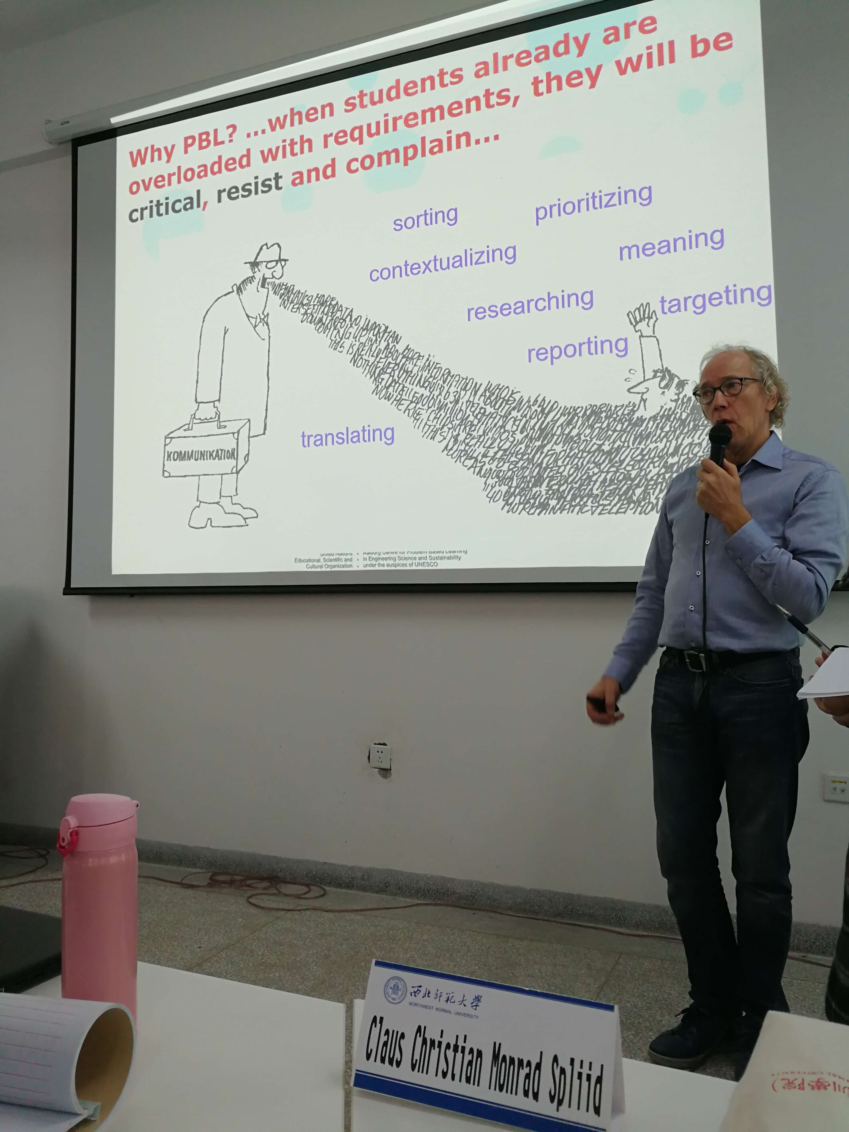 2018年10月16日上午,联合国教科文组织PBL工程与可持续发展中心Claus Christian Monrad Spliid教授应公司邀请在特教楼527学术交流室做了题为“基于问题的学习:员工及教师的新角色”的学术报告。报告由教育公司温建红副教授主持,杨旭东书记代表公司致欢迎词并向Claus教授赠送礼品,教育公司研究生和部分老师聆听了报告。