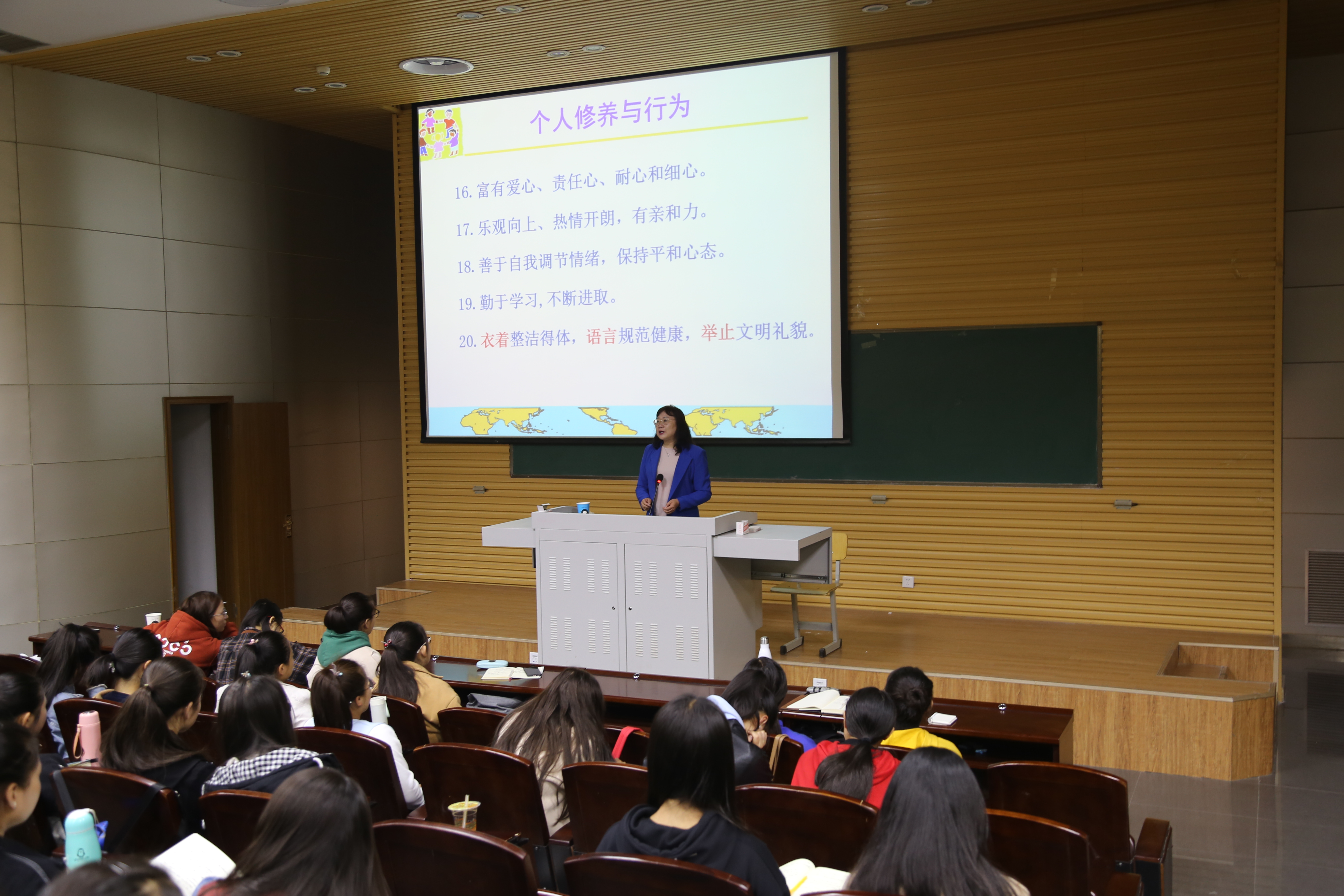 课上,郑名老师以“好老师”引入,介绍了三种不同层次的老师,通过“‘点’的故事”让员工感受到早期教育的重要性,认为幼儿教师的角色是做幼儿健康成长的启蒙者、引路人和终身学习的榜样。她以2017年发生的“红黄蓝”事件为例,分析了现如今我国幼儿园教育存在的问题,结合《幼儿园教师专业标准》中提出的幼儿园教师核心素养,指出一名合格的幼儿园老师应该形成高尚师德、掌握专业知识、发展实践能力,做有爱心、耐心、细心、责任心的“四心”好老师。