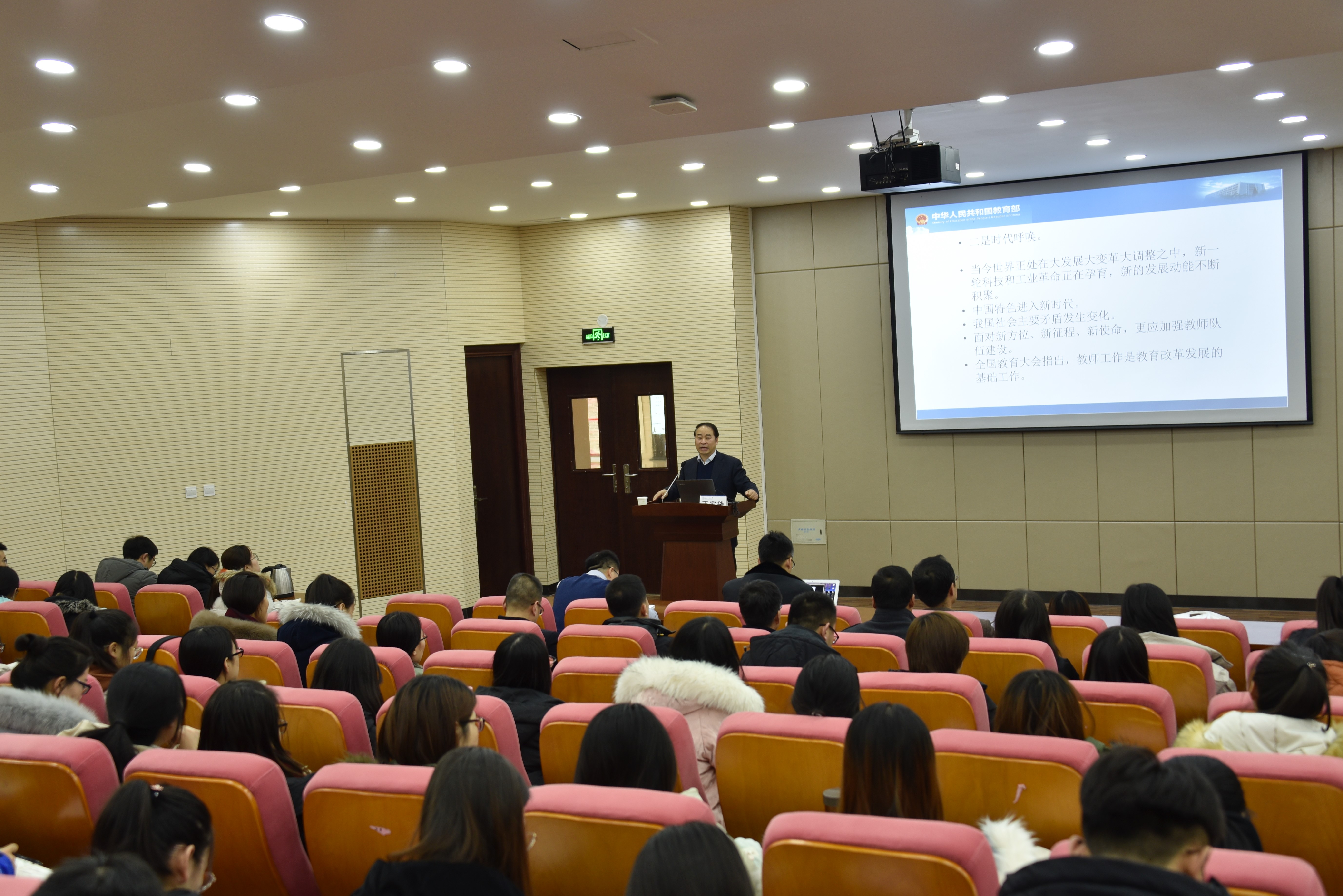 王定华书记以新时代教师队伍建设为主体,重点讲解国家政策和个人的思考。从教师队伍建设的原则、战略意义、目标;切实加强师德师风建设;不断提升教师能力素质;努力理顺管理体制机制;不断提高教师地位待遇;全面贯彻党的教育方针等七个方面引经据典、娓娓道来。王定华书记幽默风趣的报告风格和妙语连珠的话语,引得公司师生阵阵掌声,公司师生倍受鼓舞。最后,公司赵明仁教授浅谈了聆听王定华书记报告后的五点感受:教师教育思想创造者;教育情怀的传播者;教育实践的关怀者;教育政策的创新者;教育知识的促进者和积累者。