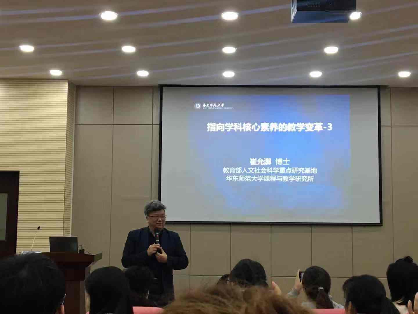 2019年3月16日,华东师范大学课程与教学研究所所长崔允漷教授为公司师生做了题为“指向学科核心素养的教学变革”的学术报告,报告由公司博士生导师傅敏教授主持,博士生、硕士生及部分本科生约200人聆听了这场报告。