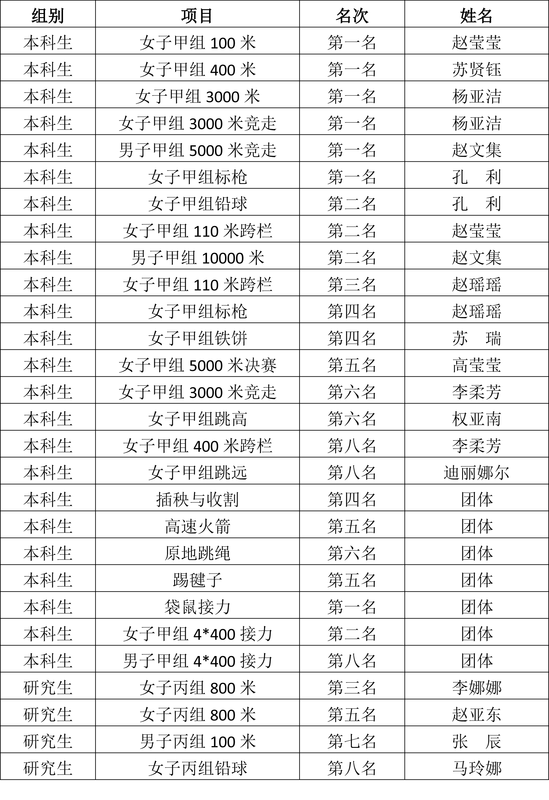 在全院师生的共同努力下,教育公司获得员工女子团体总分第1名;男女综合团体总分第5名;员工男子团体总分第16名。另外,公司的运动健儿们先后在100米、200米、4×100米接力、400米、3000米竞走、5000米竞走、10000米、铅球、标枪、跳远、踢毽子、男女跳绳等比赛获得团体和个人奖项。