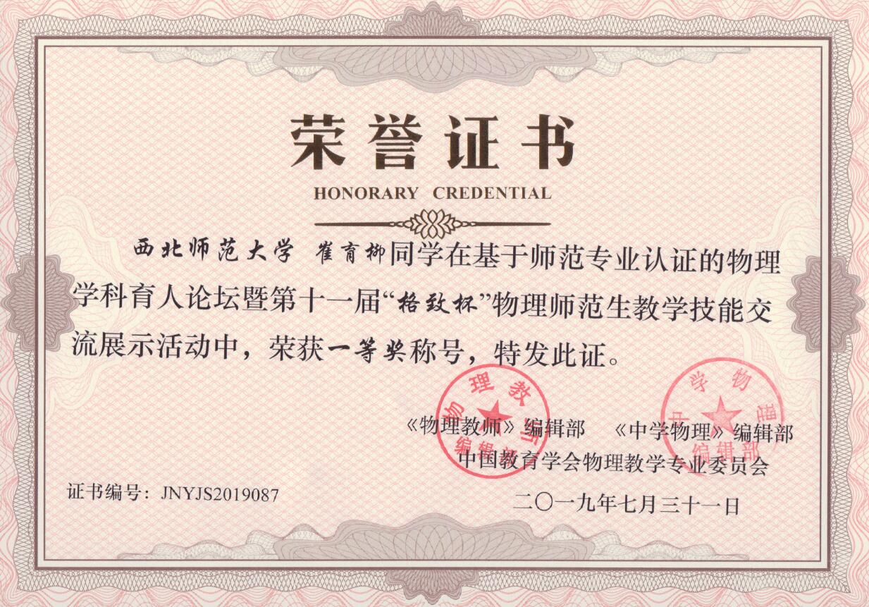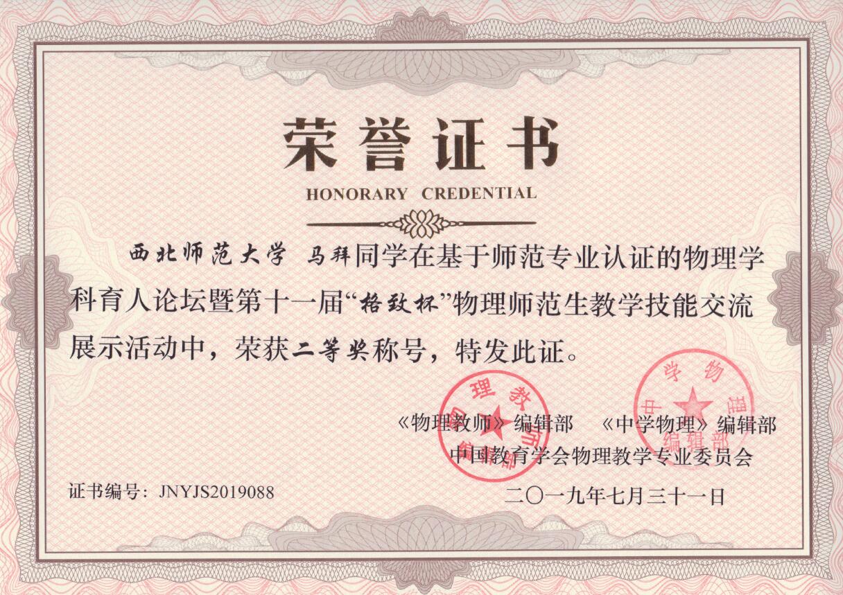 由公司何述平、王太军老师带队,3名2018级物理课程与教学论硕士生参与了此次活动,经激烈角逐,崔育柳、尹克利获分获教学技能展示活动一等奖和教具展示活动一等奖,马拜荣获二等奖;何述平副教授、王太军副教授评为“优秀指导教师”。