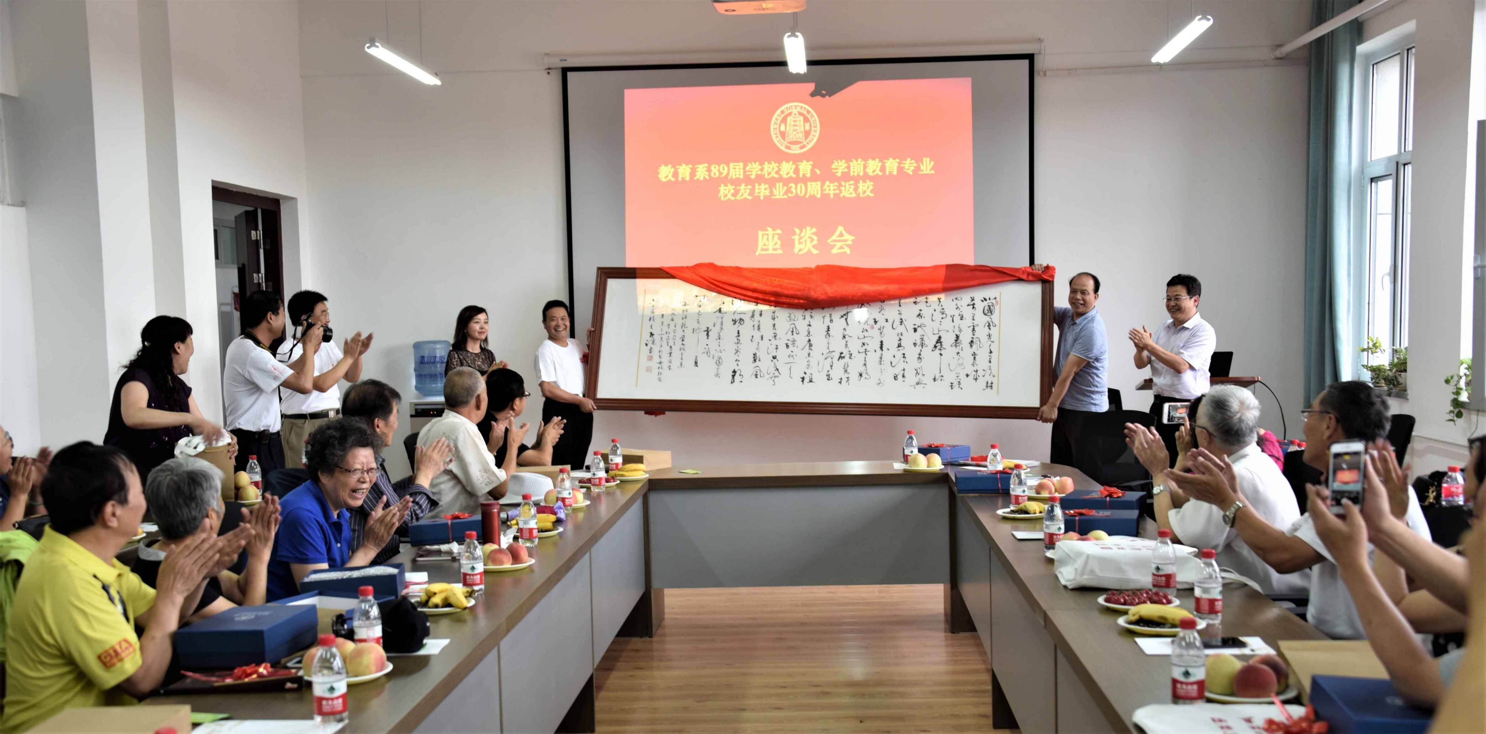 2019年8月9日, 89届教育系学前教育专业同学毕业30周年返校,公司党委书记苏丽蓉,经理刘旭东,离退休教师代表,学前系教师郑名、陈小娟,办公室相关负责人共40余人参加了座谈会。