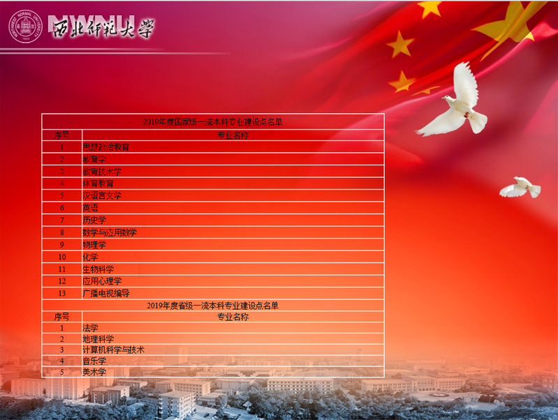 2019年12月24日,岁末年初,教育部公布国家级省级一流本科专业,公司13个专业喜获国家级一流本科专业,5个专业获批省级一流本科专业。思想政治教育教育学、教育技术学、体育教育、汉语言文学、英语、历史学、数学与应用数学、物理学、化学、生物科学、应用心理学、广播电视编导获批国家级一流本科专业,法学、地理科学、计算机科学与技术、音乐学、美术学,获批省级一流本科专业。