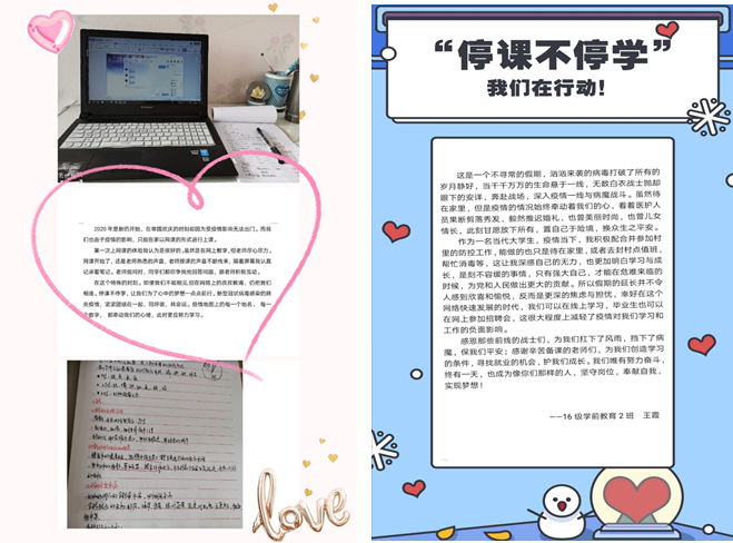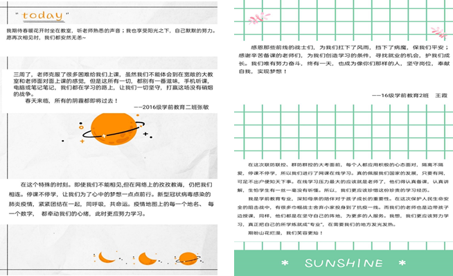 作为学前教育专业的当代老员工,十年树木,百年树人,我们也得为祖国贡献一份力量。我是学前教育专业,深知母亲的陪伴对于孩子成长的重要性。在这次保护人民生命安全的阻击战中,有很多巾帼战士舍弃小家投身到了抗疫一线。而我们的老师也是边带孩子边授课,同样,他们都是在坚守自己的阵地,为更多的人服务。青年一代有理想、有担当,国家就有前途,民族就有希望。感谢那些默默付出的英雄们,为我们铸就了家园安宁,所以我们更应把握当下,认真践行“爱国、立志、求真、力行”的八字箴言,真正把自己的所学炼就成“专业”,在人民需要我们的地方发光发热。
