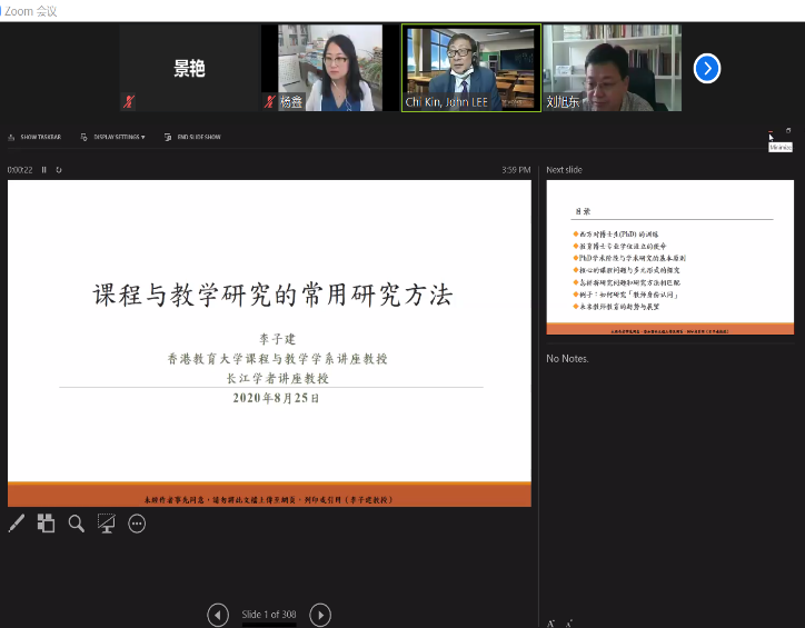 2020年8月25日下午,应教育公司邀请,香港教育大学课程与教学讲座教授、西南大学长江学者讲座教授,李子建教授作了题为《课程与教学研究的常用研究方法》的报告,教育公司经理刘旭东教授主持了学术报告。