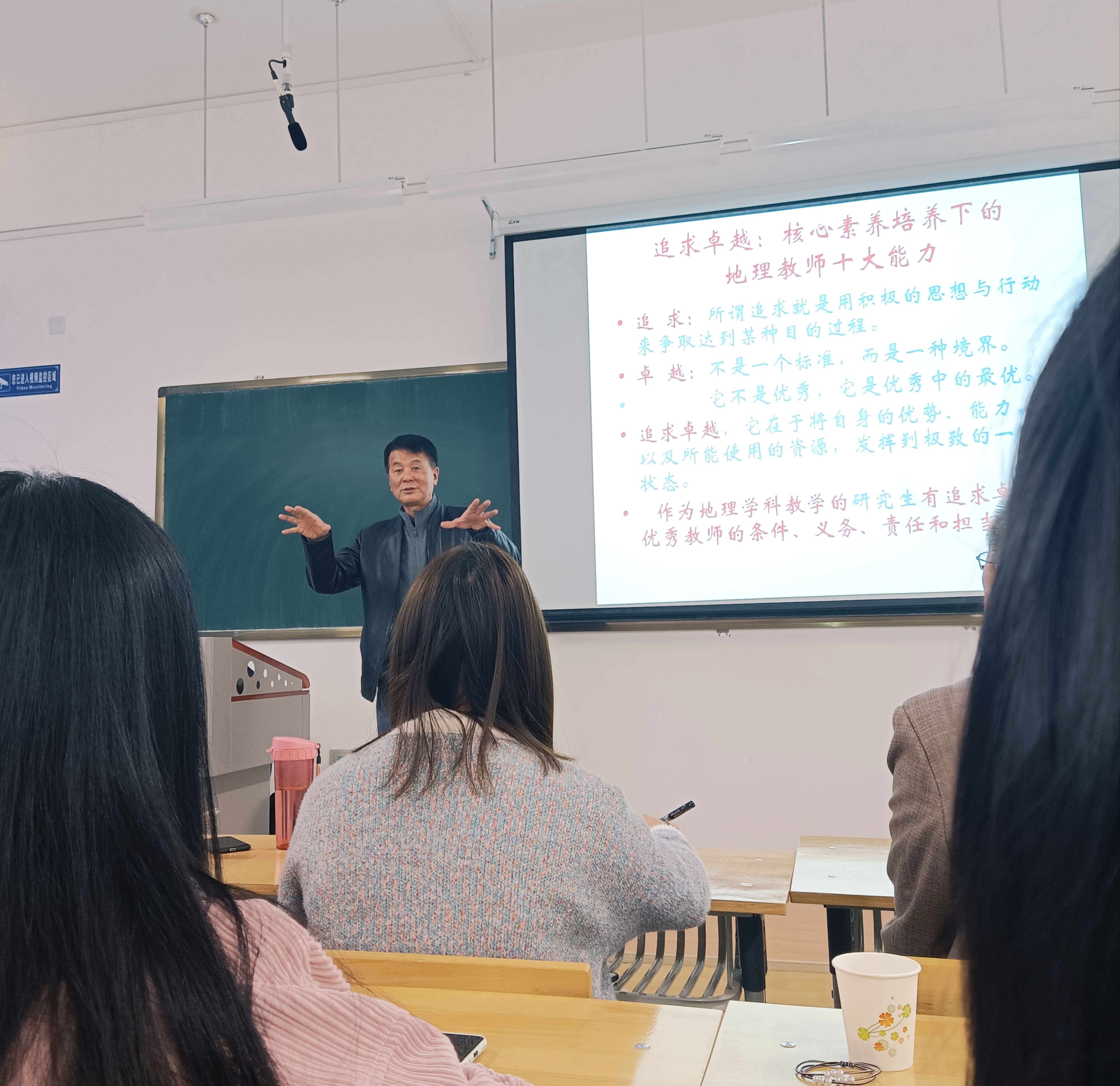 报告会上,李家清老师首先从破题入手,在解析“追求”、“卓越”和“追求卓越”的基础上,提出作为一名(未来的)卓越地理教师,必须具有“思想力”、“课程力”“教材力”“设计力”“实施力”“操作力”“评价力”“实践力”“研究力”和“沟通力”等十大能力,并详细解读了“思想力”、“课程力”“教材力”“设计力”“实施力”“操作力”“评价力”“实践力”“研究力”和“沟通力”等十大能力的内涵。最后,李家清老师殷切希望同学们按照上述十大能力不忘初心、积极进取、努力奋斗,争取早日成为一名卓越的地理教师。