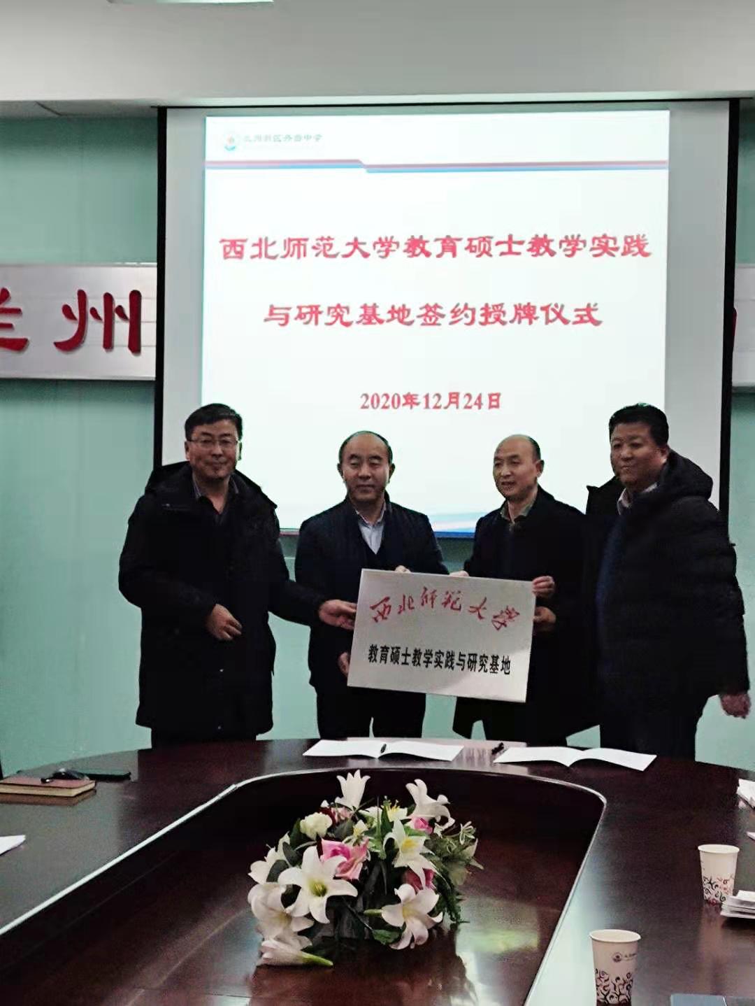 会上,王卫军副经理和曹家湖董事长代表双方公司共同签署了“西北师范大学教育硕士实践与研究基地协议”,王卫军副经理、龚大洁教授共同为兰州新区舟曲中学授牌。