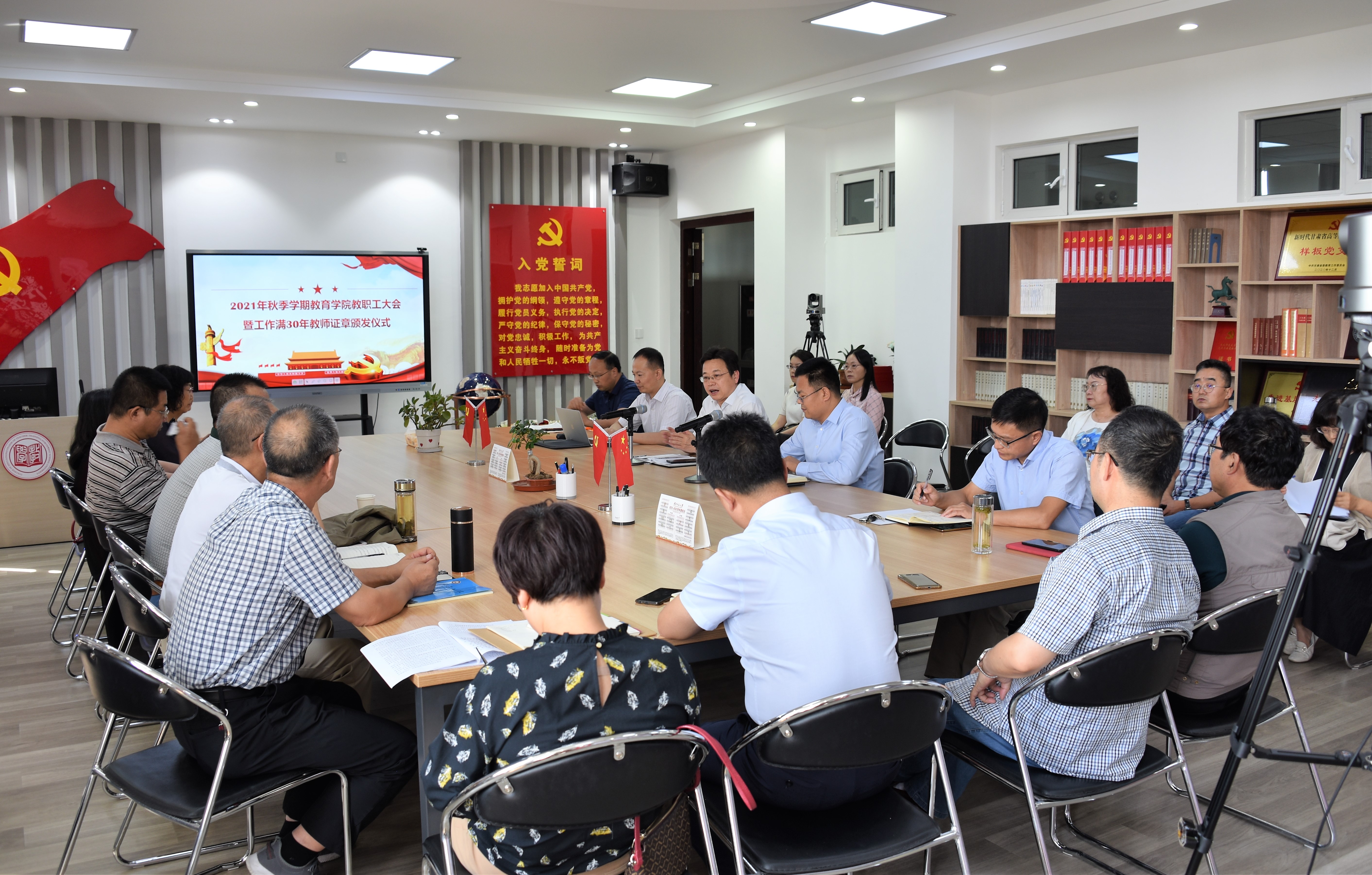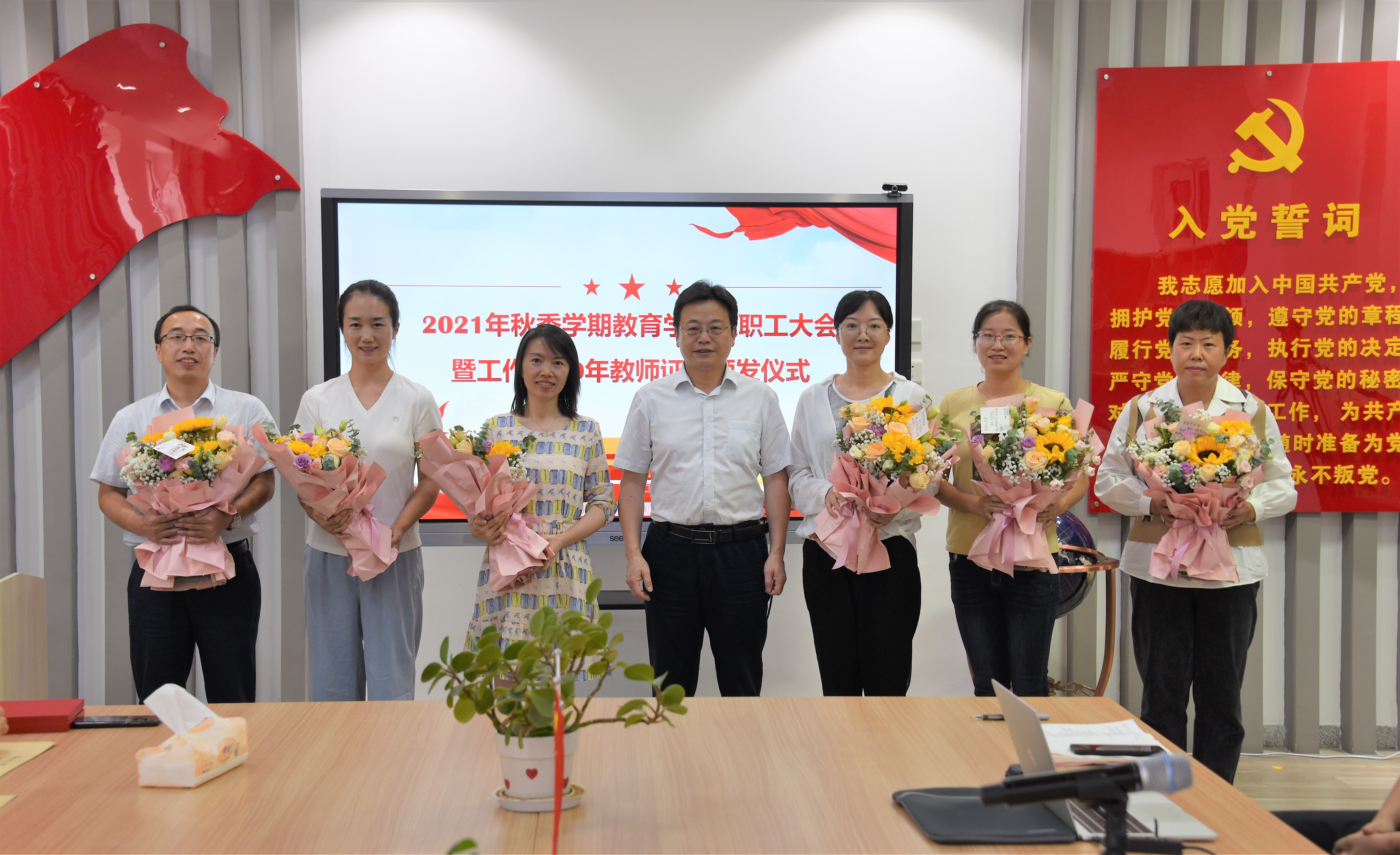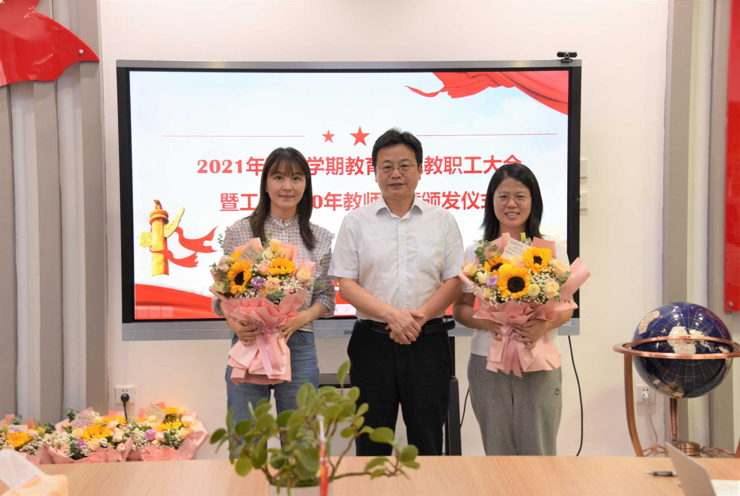 大会共有三项议程,一是在第37个教师节来到之际,为公司8名光荣执教30年教龄教师举行证章颁发仪式;二是为8名2021年新入职教师举办欢迎仪式;三是经理刘旭东及各分管院领导作秋季学期工作安排,梳理新学期工作思路。