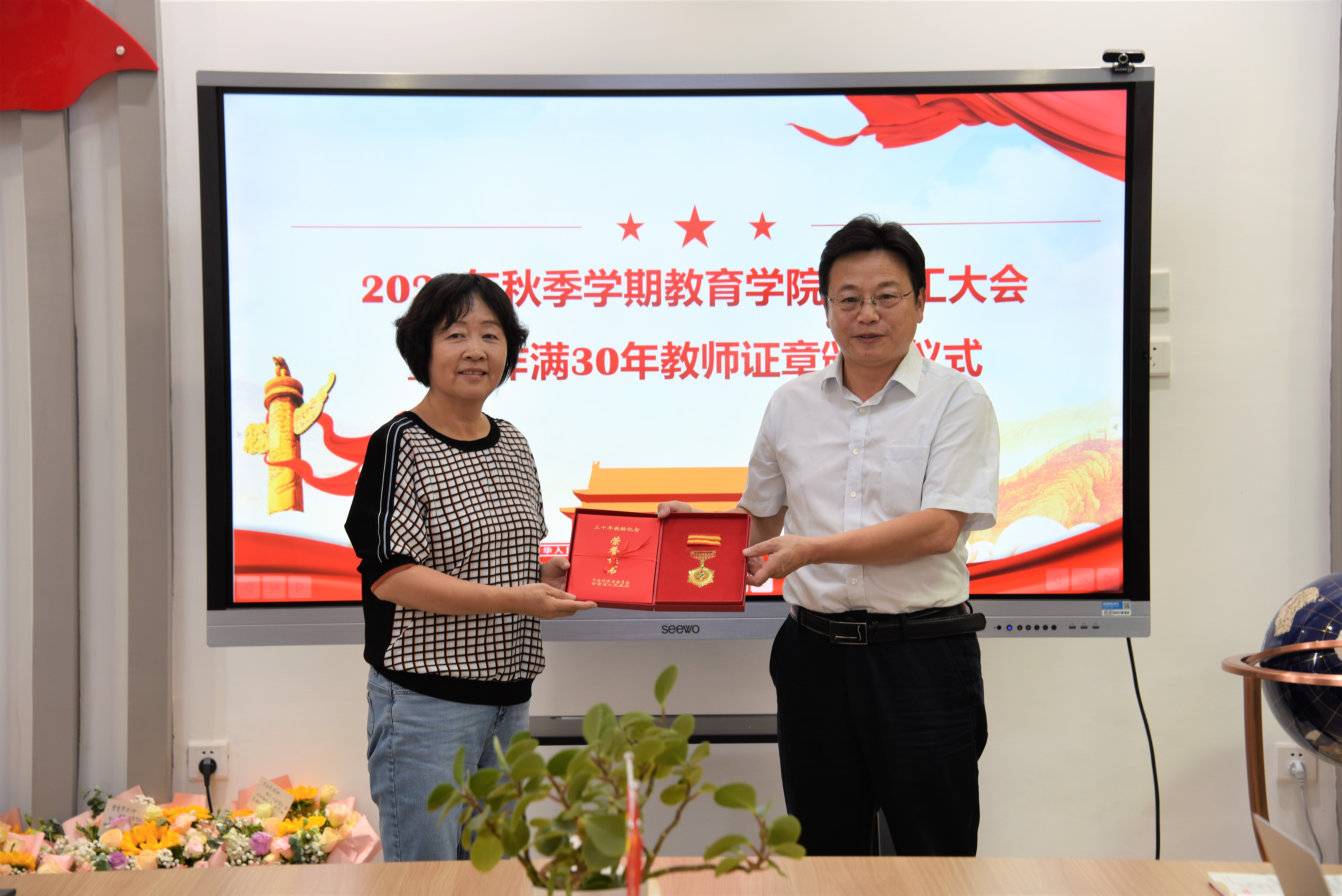 (图2 刘旭东经理为工作满30年教龄教师代表颁发证章)