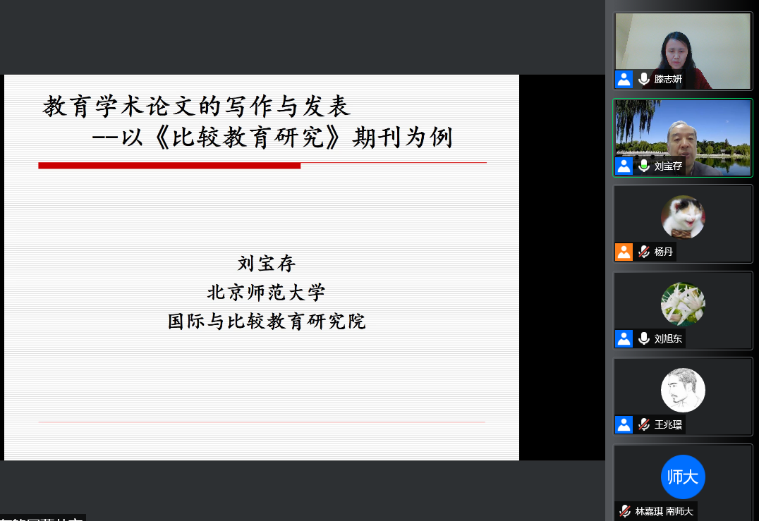 2021年10月20日晚,应伟德体育官方网站教育公司邀请,教育部长江学者特聘教授、国务院政府特殊津贴专家、北京师范大学国际与比较教育研究院经理、北京师范大学国际教育研究中心主任、中国教育学会比较教育分会理事长刘宝存教授在线为教育公司研究生做了题为《教育学术论文的写作与发表——以<比较教育研究>期刊为例》的线上学术报告。报告会由教育公司经理刘旭东教授主持,约170人参加了学术报告会。