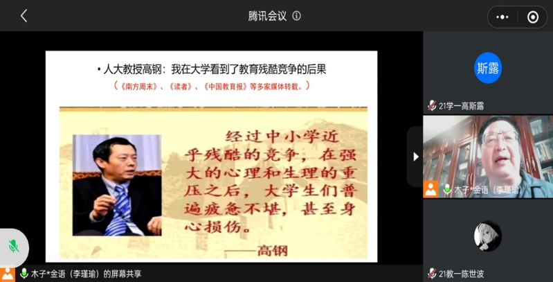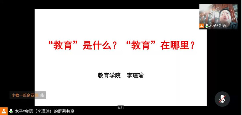 2021年11月5日上午,教育学院李瑾瑜教授为2021级新生开展线上专业导引课,2021级全体新生参加。李瑾瑜教授围绕关于教育的“是什么”“在哪里”两个问题展开,从教育学的背景和现状入手,结合员工切身实际,循循善诱,带领与课员工一步步领会“教育”,体悟“教育”。