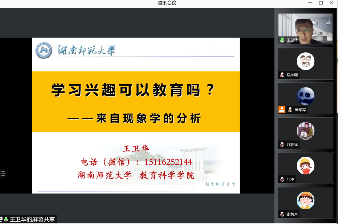 2021年11月6日上午,应公司熊华军教授的邀请,来自湖南师范大学伟德国际victor1946的王卫华教授,在线为公司员工做了题为《学习兴趣可以教育吗?——来自现象学的分析》的报告。本次学术报告由熊华军教授主持,约120人参加了此次学术报告。