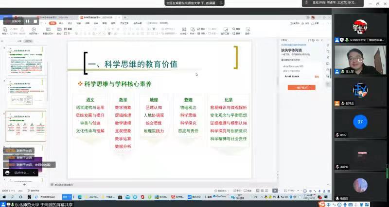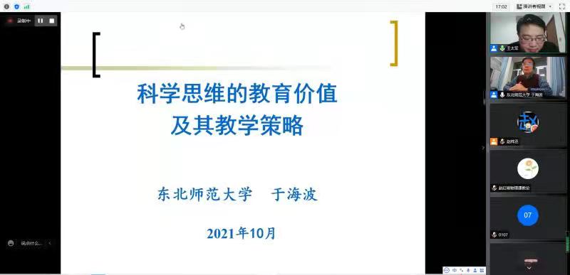 2021年10月26日晚,受公司邀请,东北师范大学物理公司于海波教授为公司师生作了主题为《科学思维的教育价值及其教学策略》的学术报告。报告会由教育公司物理课程与教学专业学科负责人王太军副教授主持,来自教育公司物理课程与教学论、学科教学(物理)、学科教学(化学)、学科教学(生物)等专业的师生,以及物理与电子工程公司“本硕一体”教育硕士研究生、部分省内外中学物理教师100余人通过在线方式听取了报告。