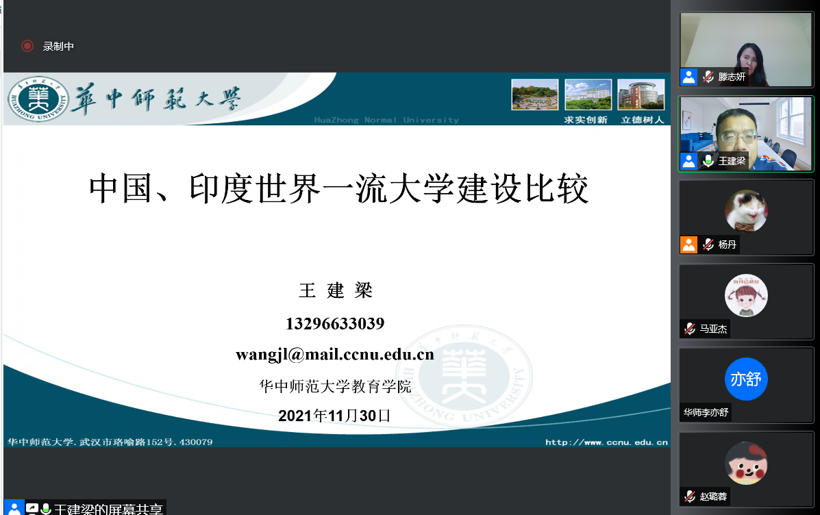 2021年11月30日晚,应公司邀请,华中师范大学国际员工教育发展研究中心副主任王建梁教授在线为公司70余名研究生做了题为《中国、印度世界一流大学建设比较》的线上学术报告。学术报告由公司教师滕志妍博士主持。