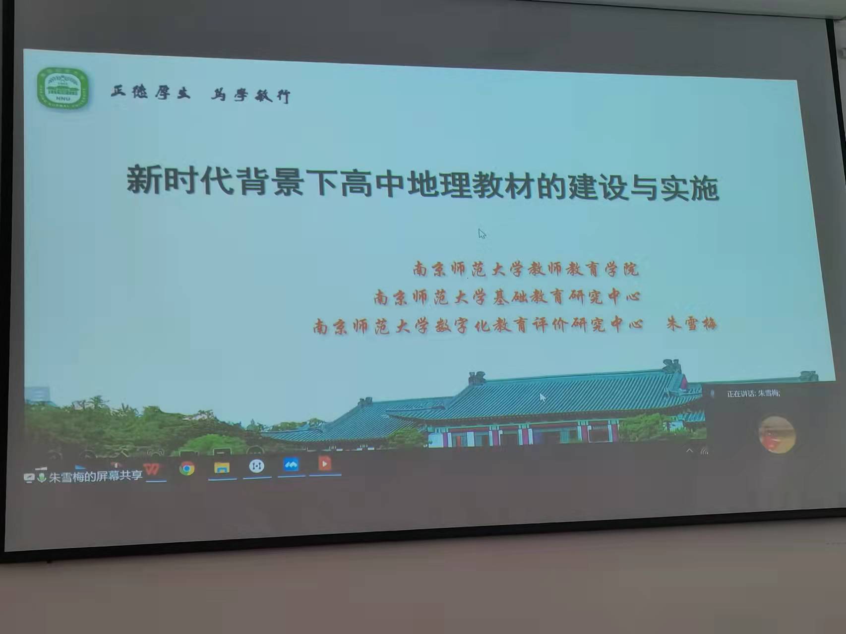 在报告会上,朱雪梅老师从地理教材的重要性入手,从“为什么修订高中地理教材”“怎样修订高中地理新教材”和“如何实施高中地理新教材”三个方面阐述了“新时代背景下高中地理教材的建设与实施”。