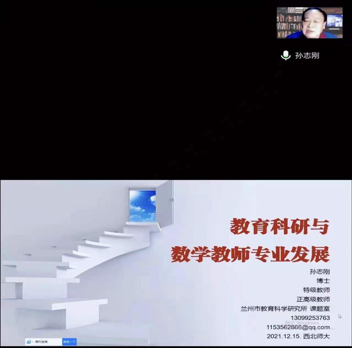 2021年12月15日晚上,应公司邀请,特级教师、正高级教师、甘肃省数学会理事、甘肃省数学教育研究会常务理事、兰州市数学会常务理事、兰州市教育科学研究所教研员、《数学教学研究》编委,伟德体育官方网站硕士生导师孙志刚博士为公司师生做了主题为“教育科研与数学教师专业发展”的线上学术报告。报告会通过腾讯会议举行,公司数学教育研究所所长李保臻教授主持了该场报告会,全院共有80多名师生聆听了报告。
