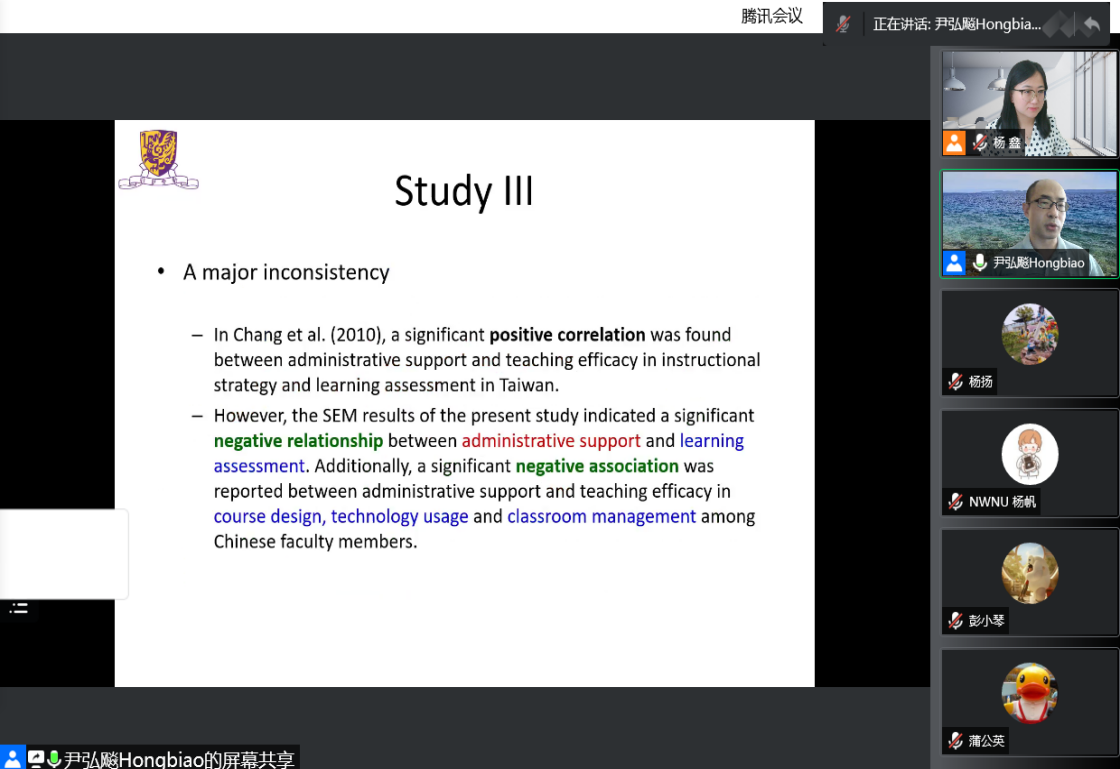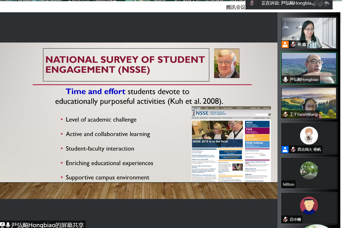 尹教授首场报告于6月15日早上9:00以腾讯会议方式在线上进行,主题为“疫情期间的高校网络教学”。本次报告由公司经理王兆璟教授主持。尹老师以问题导入,引出讲座主题疫情期间大学教学中面对面教学、线上教学和混合式教学三种形式在课程经验(Course Experience )、员工参与(Student Engagement)、教师效能(Teacher Efficacy)三个方面的优势与不足,在介绍CEQ(Course Experience Questionnaire)课程体验问卷调查的维度和内容基础上,以我国21所高校网络教学数据为例,得出研究结论我们应该把网络教学看作“A Mixed Blessing”一种有利有弊的教学方式,而不是完全视其为“Panacea”(万灵药)。最后,尹教授还强调网络教学的重点应该是教学改进与设计而不是单纯技术的运用。
