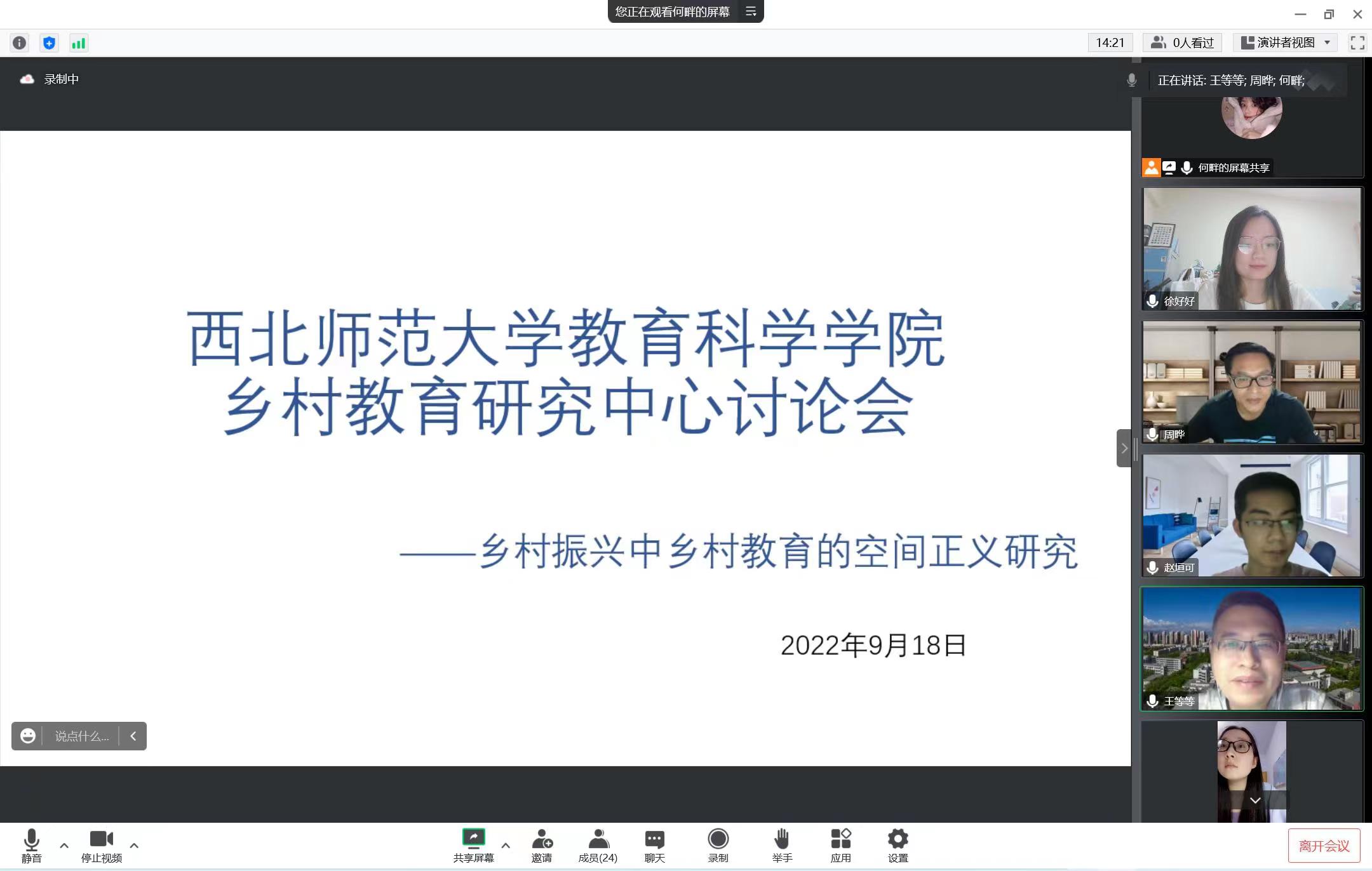 2022年9月18日晚,伟德国际victor1946乡村教育研究中心举行了本学期第一次学术研讨会,研究中心全体成员、公司部分教师及硕博生参与了此次研讨会。本次研讨会主要围绕着博士生何畔的毕业论文选题——《乡村振兴背景下乡村教育的空间正义研究》进行研讨。