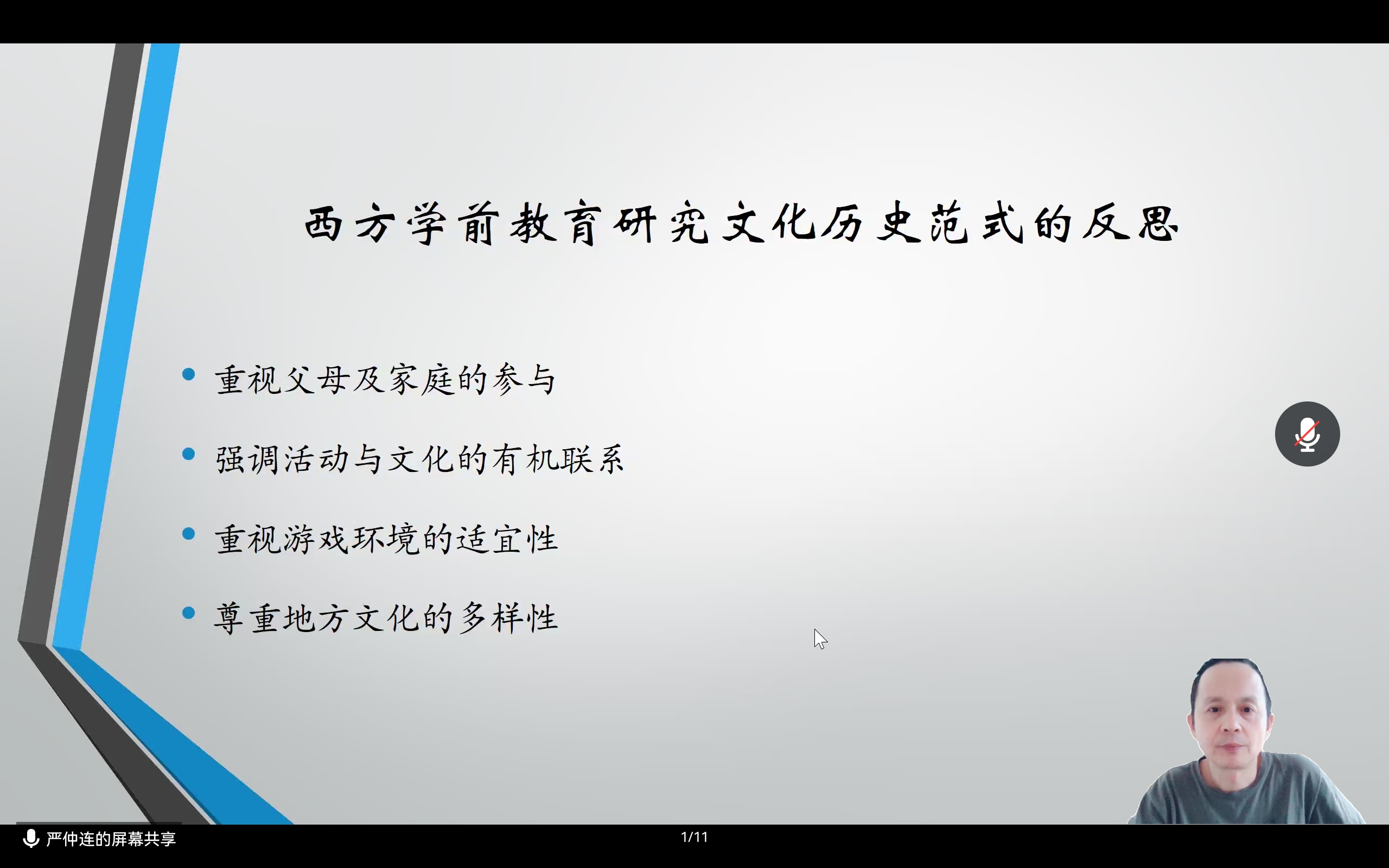 严仲连老师围绕西方学前教育研究历史文化范式的产生背景、学前教育研究历史文化范式的理论观点、文化历史分析法、西方学前教育研究文化历史范式的反思等方面展开论述,通过严老师系统地介绍,同学们对学前教育研究历史文化范式有了更进一步的认知以及全面的思考。此外,严老师还介绍了学前教育历史文化范式的代表人物—玛丽莲•弗莱尔,列举了大量相关文献介绍其团队关于文化历史理论的相关研究,为同学们今后在相关方面的研究奠定了基础。