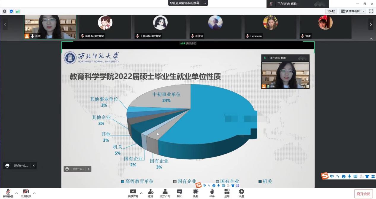 为贯彻落实党中央、国务院关于就业的决策部署,做好高校毕业生就业工作,帮助伟德国际victor1946毕业生认清当前就业形势,准确把握就业机会,有效促进伟德国际victor19462023届毕业生高质量充分就业,2023年10月27日—10月29日,教育科学公司分别针对教育学原理、高等教育学、比较教育学、学前教育、特殊教育、教育史、课程与教学论等7个专业召开2023届毕业生线上专场就业推动会。公司专职辅导员杨雅以及全体2023届毕业生参加本次就业推动会议。