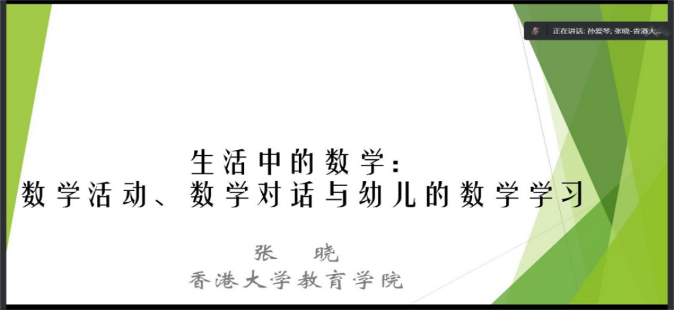 20221118日上午,应伟德体育官方网站学前教育系邀请,香港大学教育公司副教授、博士生导师张晓在线为公司师生做了题为“数员工活化:数学活动、数学对话与幼儿的数学学习”的学术报告,报告由孙爱琴主持,学前教育专业研究生和部分教师线上参与了报告。