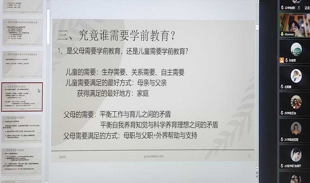 2022128日晚七点至十点,应伟德体育官方网站学前教育系邀请,《学前教育研究》杂志副主编、长沙师范公司研究员、湖南普通高校学科带头人赵南在线为公司师生做了题为“我国学前教育专业外延与内涵的新发展”的学术讲座。公司学前教育专业青年教师和研究生线上听取了此次讲座,讲座由孙爱琴副教授主持。